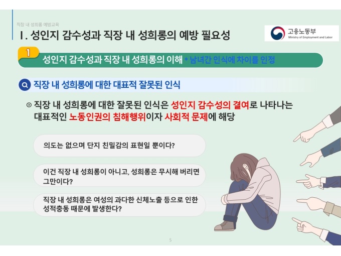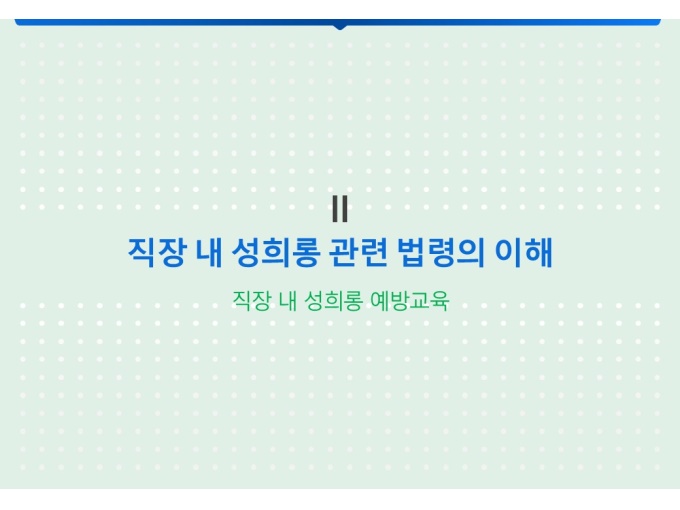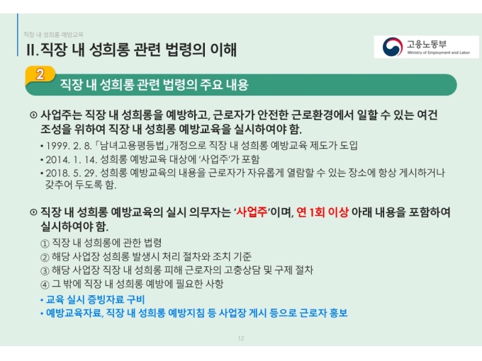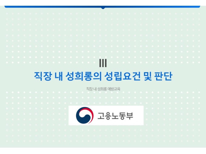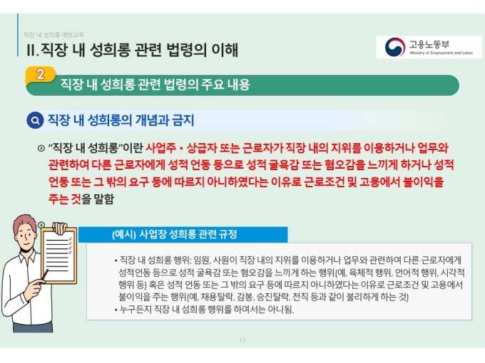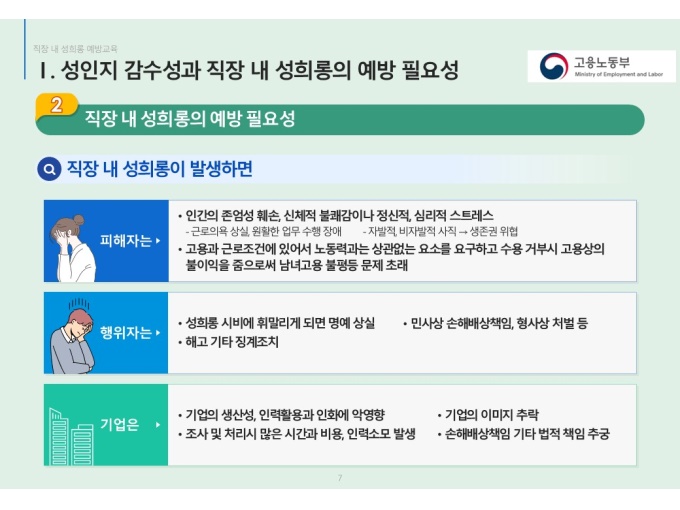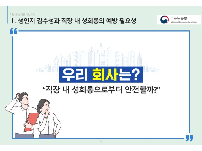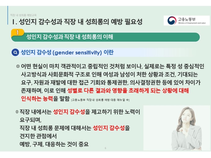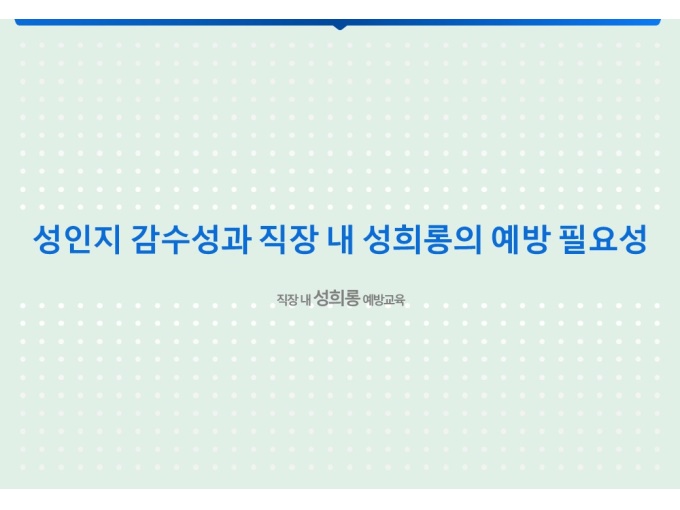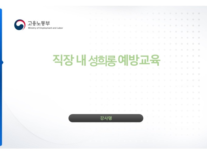고용노동부에서 제공하는 직장내 성희롱 예방교육 표준 강의안 자료로 모든 사업장에서 법적 의무로 시행하는 성희롱 예방교육의 기본 틀을 제공합니다. 이 강의안은 성인지 감수성과 직장 내 성희롱의 예방 필요성, 직장 내 성희롱 관련 법령의 이해, 직장 내 성희롱의 성립요건 및 판단, 직장 내 성희롱의 구제, 대응 및 후속조치를 포함합니다.