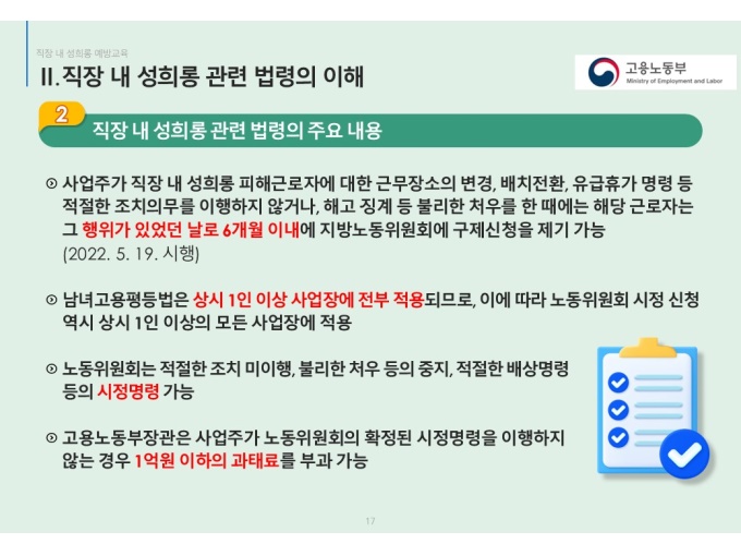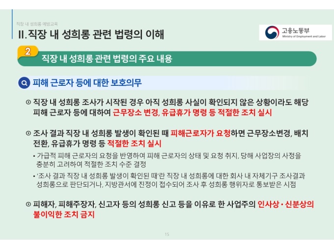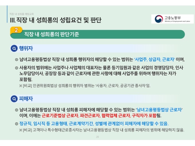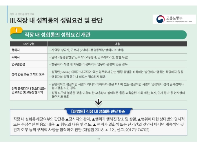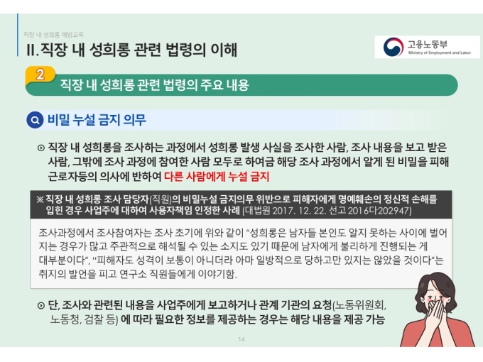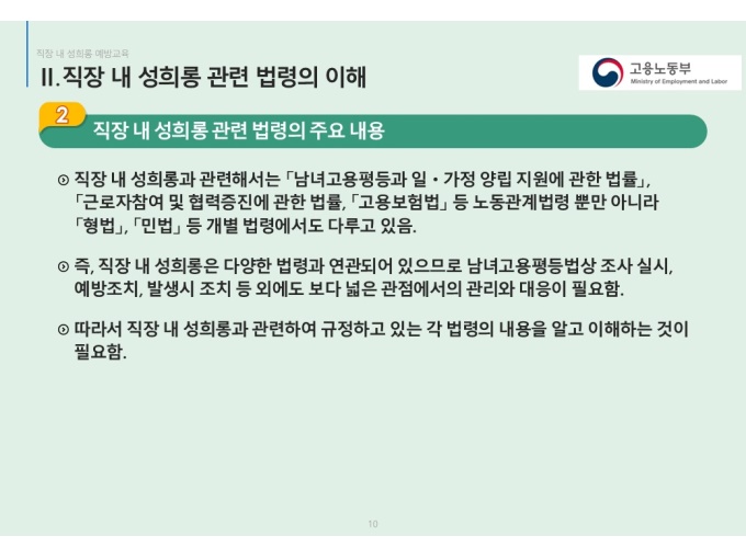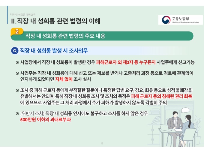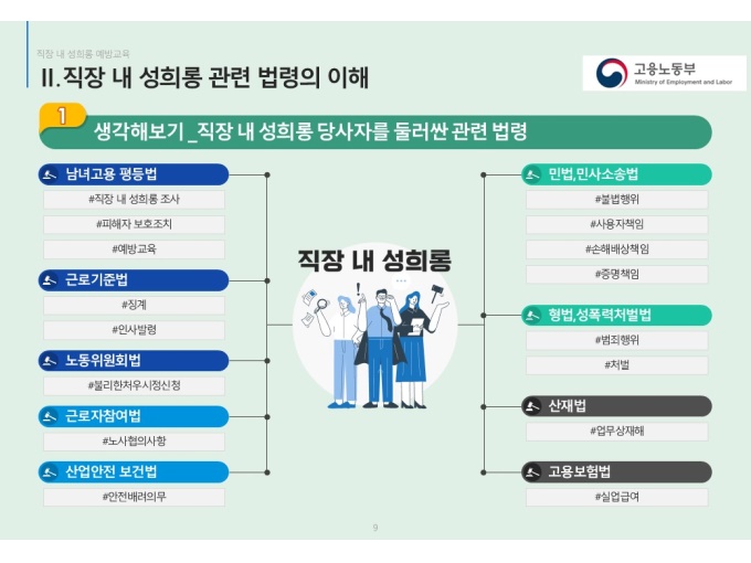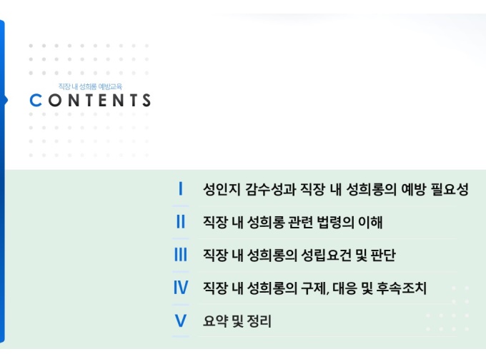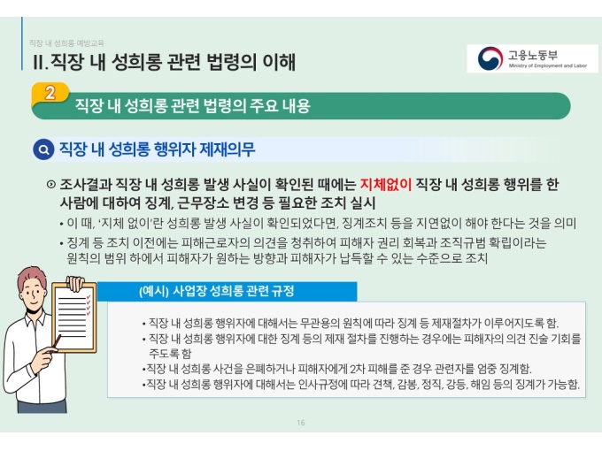 고용노동부에서 제공하는 직장내 성희롱 예방교육 표준 강의안 자료로 모든 사업장에서 법적 의무로 시행하는 성희롱 예방교육의 기본 틀을 제공합니다. 이 강의안은 성인지 감수성과 직장 내 성희롱의 예방 필요성, 직장 내 성희롱 관련 법령의 이해, 직장 내 성희롱의 성립요건 및 판단, 직장 내 성희롱의 구제, 대응 및 후속조치를 포함합니다.