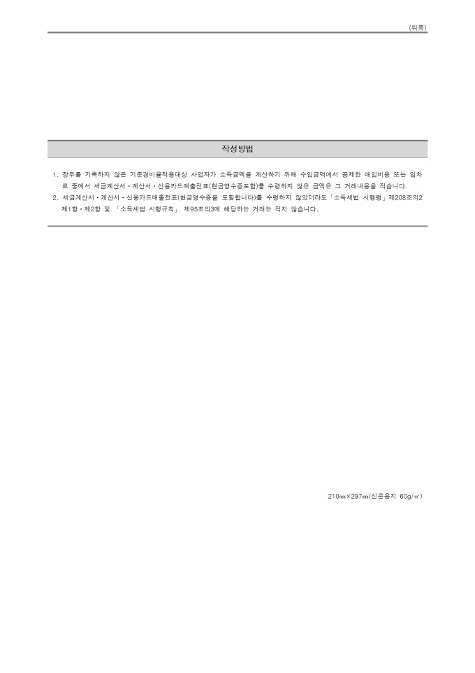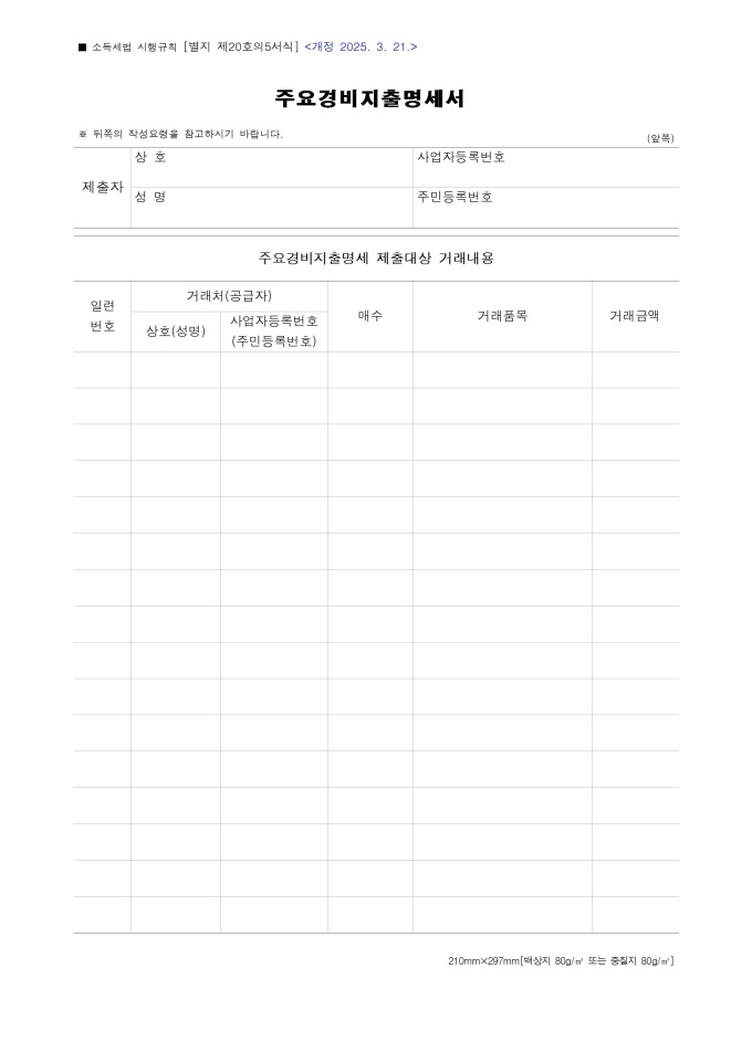 주요경비지출명세서 서식입니다. 장부를 기록하지 않은 기준경비율적용대상 사업자가 소득금액을 계산하기 위해 수입금액에서 공제한 매입비용 또는 임차료 중에서 세금계산서ㆍ계산서ㆍ신용카드매출전표(현금영수증포함)를 수령하지 않은 금액은 그 거래내용을 적습니다. 또한 세금계산서ㆍ계산서ㆍ신용카드매출전표(현금영수증을 포함합니다)를 수령하지 않았더라도「소득세법 시행령」제208조의2제1항ㆍ제2항 및 「소득세법 시행규칙」 제95조의3에 해당하는 거래는 적지 않습니다. 소득세법 시행규칙 [별지 제20호의5서식] <개정 2025. 3. 21.>