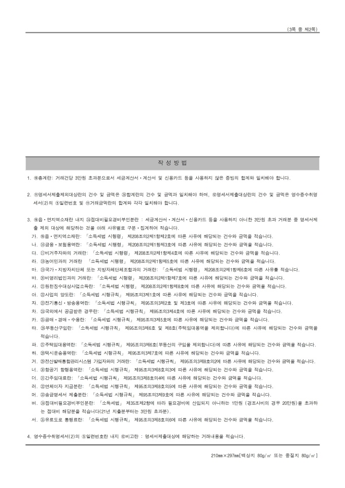 영수증수취명세서 서식입니다. 「소득세법」 제70조제4항제5호 및 같은 법 시행령 제132조제3항에 따라 영수증수취명세서를 제출할 때 사용할 수 있는 서식입니다. 소득세법 시행규칙 [별지 제40호의5서식]