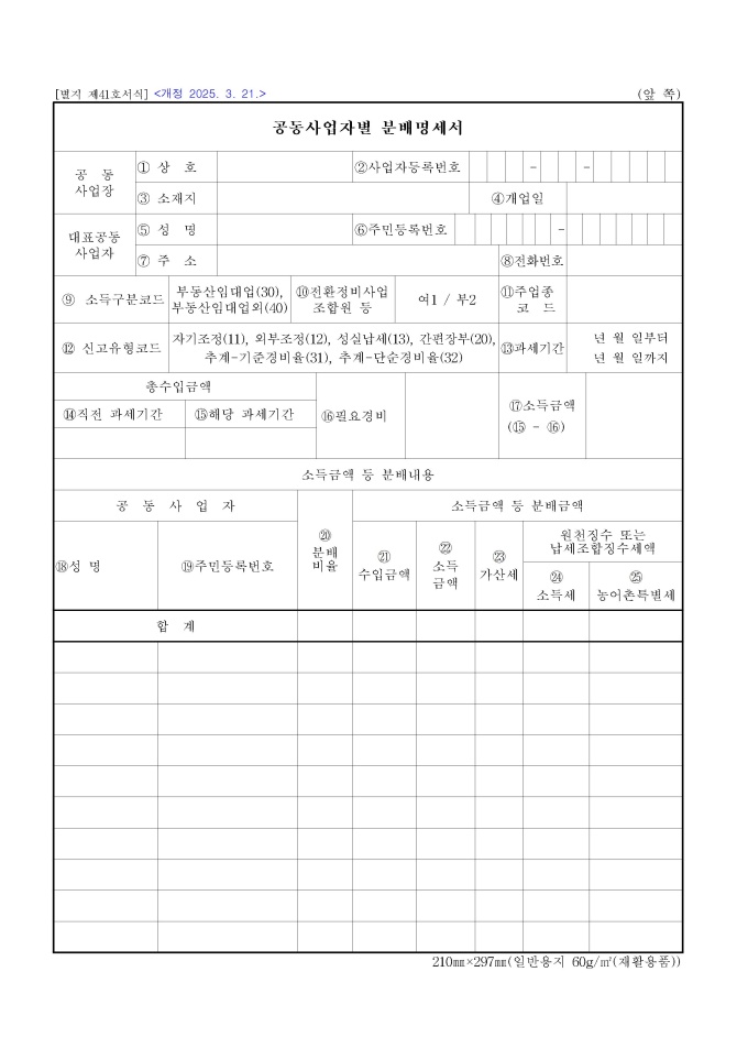 9,000원/월공동사업자별 분배명세서 서식입니다. 소득세법 시행규칙 [별지 제41호서식] <개정 2025. 3. 21.>