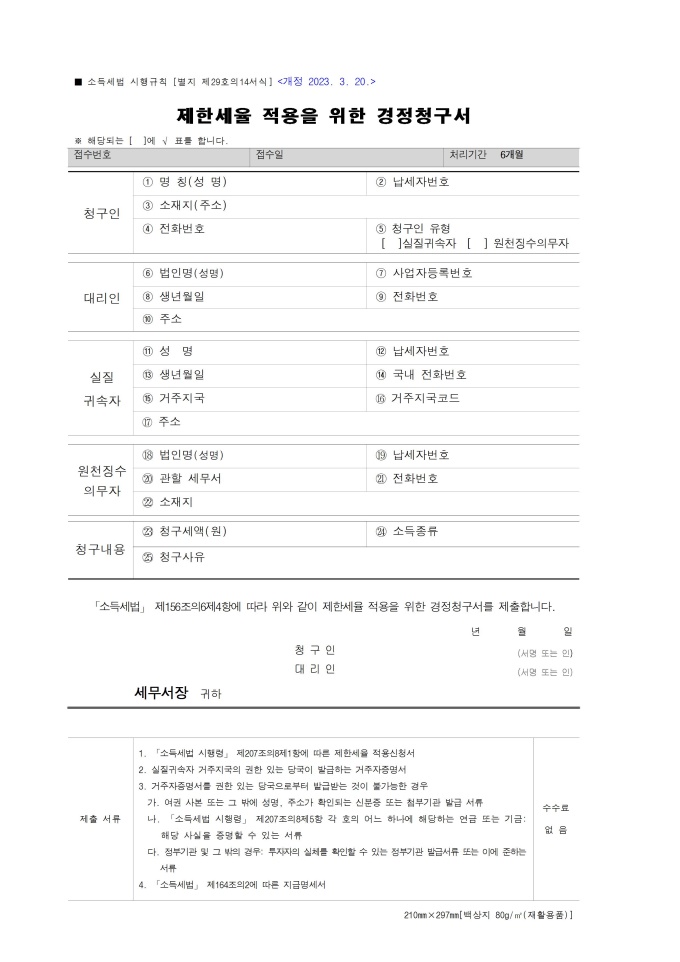 제한세율 적용을 위한 경정청구서 서식입니다. 「소득세법」 제156조의6제4항에 따라 제한세율 적용을 위한 경정청구서를 제출하고자 할 때 사용할 수 있는 서식입니다.