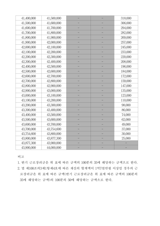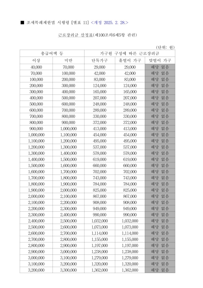 근로장려금 산정표 서식입니다. 반기 근로장려금은 해당 표에 따른 금액의 100분의 35에 해당하는 금액으로 하며, 법 제100조의3 제1항 제4호에 따른 재산의 합계액이 1억7천만원 이상인 경우의 근로장려금은 해당 표에 따른 금액(반기 근로장려금은 해당 표에 따른 금액의 100분의 35에 해당하는 금액)의 100분의 50에 해당하는 금액으로 합니다. 조세특례제한법 시행령 [별표 11] <개정 2025. 2. 28.>