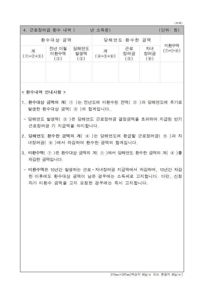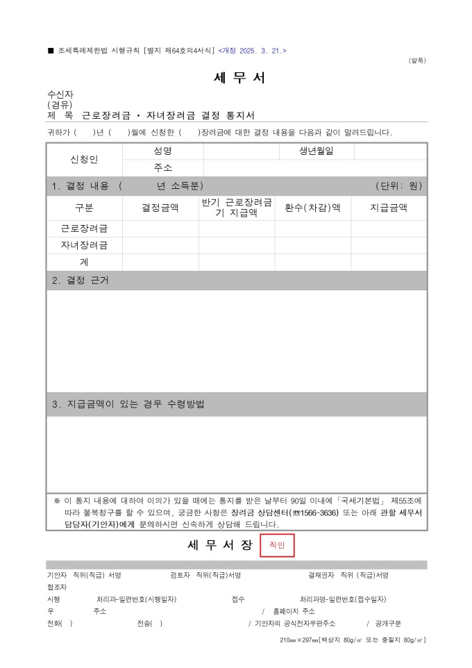 근로장려금·자녀장려금 결정 통지서 서식입니다. 근로, 자녀장려금 신청에 대한 결정 내용을 알리고자 할 때 사용할 수 있는 서식입니다. 조세특례제한법 시행규칙 [별지 제64호의4서식] <개정 2025. 3. 21.>