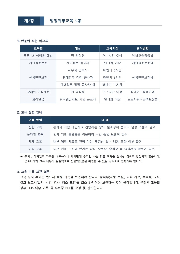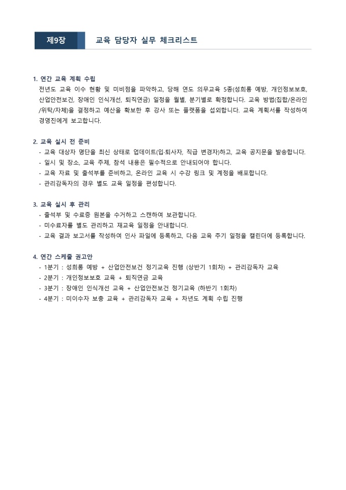 - 교육 몰아서 실시 방지 : 여러 법정의무교육을 연말에 한꺼번에 실시하면 형식적인 교육이 되고 직원 부담이 증가. 월별로 1~2개씩 분산하여 계획하면 교육 품질과 직원 수용도 모두 높아짐