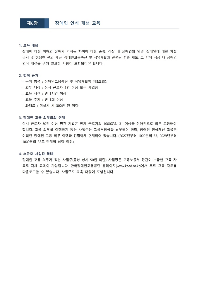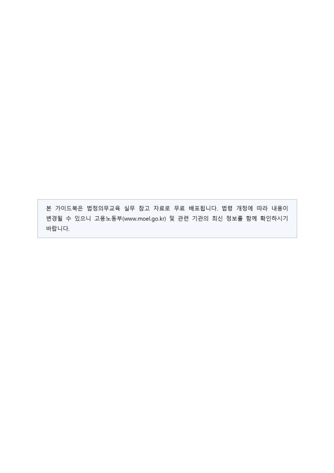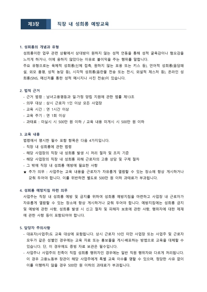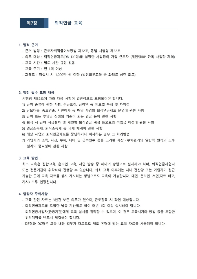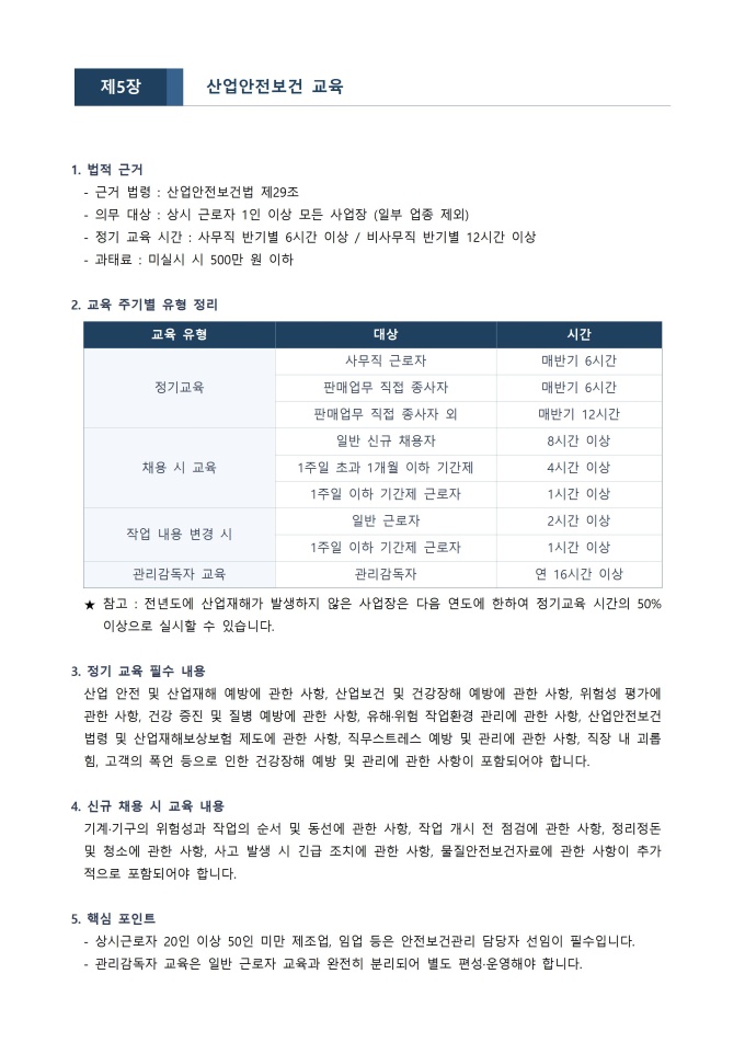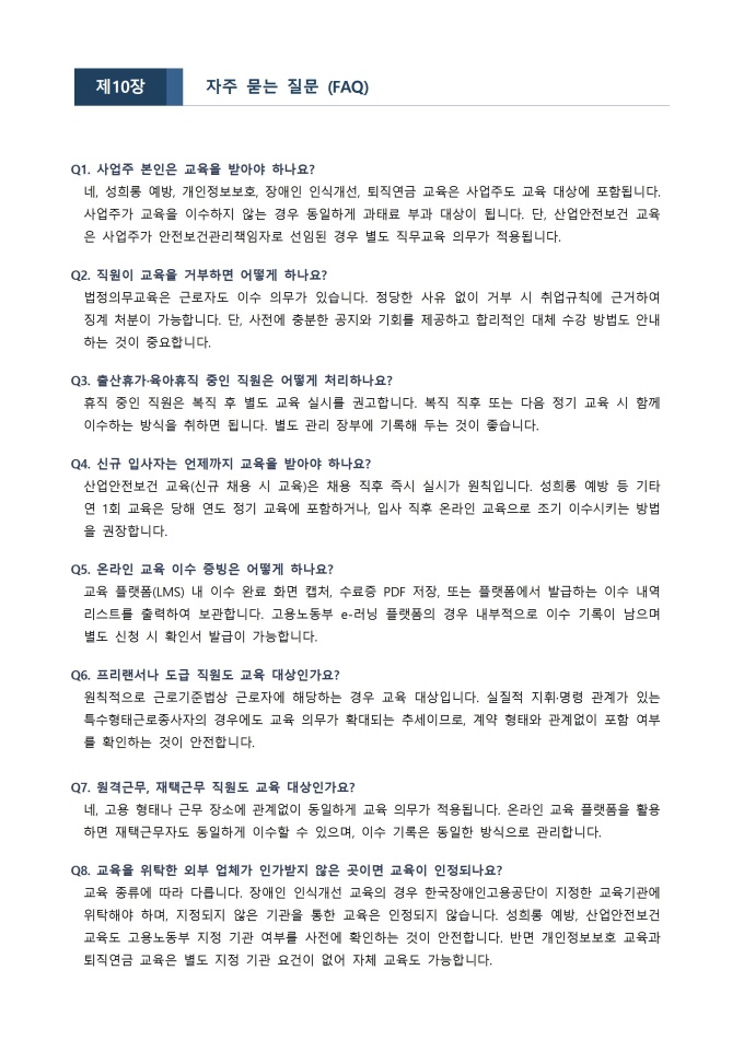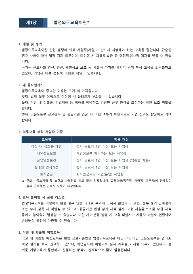 법정의무교육 가이드북은 기업이 법령에 따라 반드시 실시해야 하는 의무 교육의 종류, 대상, 실시 횟수, 방법, 미실시 시 제재를 한 곳에 정리하여 교육 담당자가 연간 의무 교육을 빠짐없이 계획하고 이행하는 데 활용하는 실무 지침서입니다.