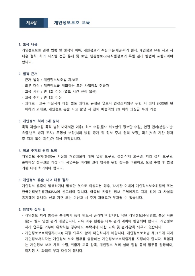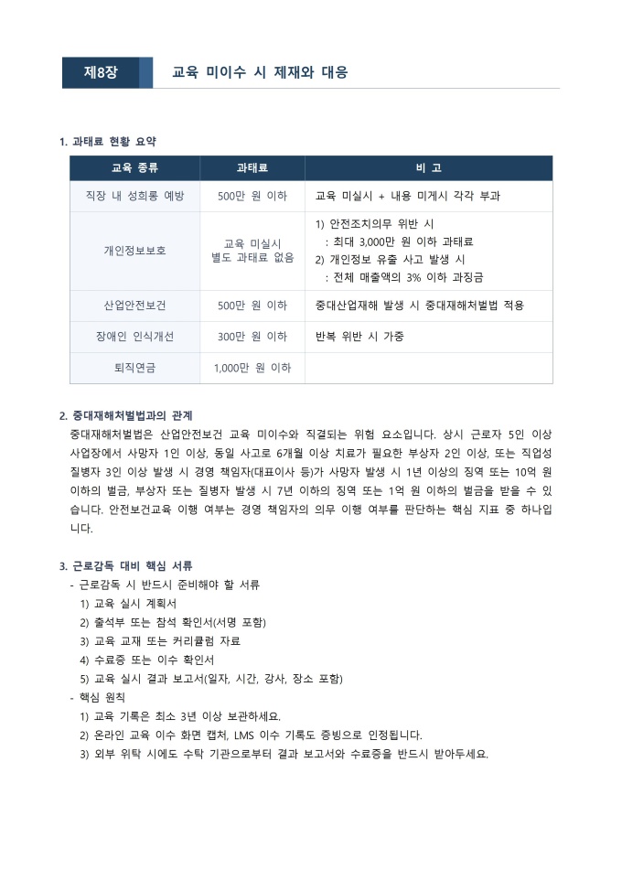 법정의무교육 가이드북을 연초에 확인하여 해당 연도에 실시해야 할 교육 전체를 월별 일정으로 변환하는 것이 가장 중요합니다. 각 교육의 실시 기한을 회사 캘린더에 등록하고 실시 2주 전 담당자에게 알림을 설정하면 기한을 놓치는 일을 원천적으로 방지할 수 있습니다. 교육 실시 후에는 반드시 교육 일지와 참석자 서명부를 작성하여 보관하세요. 과태료는 교육을 실시하지 않았을 때 뿐만 아니라 증빙을 제대로 보관하지 않았을 때도 부과될 수 있습니다.