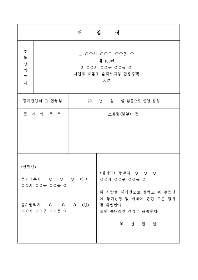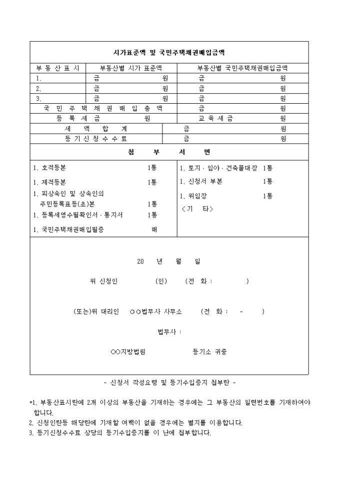 9,000원/월소유권이전등기(실종으로인한상속)신청서 입니다. ○○시 ○○구 ○○동 대 200㎡ 이 상 ... - 신청서 작성요령 및 등기수입증지 첩부란 - *1. 부동산표시란에 2개 이상의 부동산을 기재하는 경우에는 그 부동산의 일련번호를 기재하여야 합니다. 2. 신청인란등 해당란에 기재할 여백이 없을 경우에는 별지를 이용합니다. 3. 등기신청수수료 상당의 등기수입증지를 이 난에 첩부합니다.