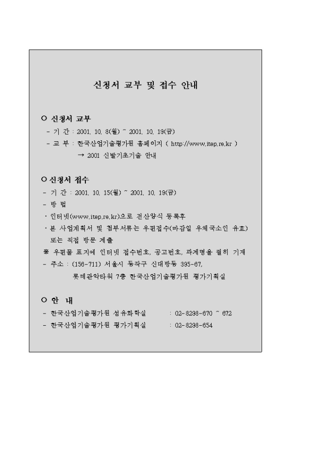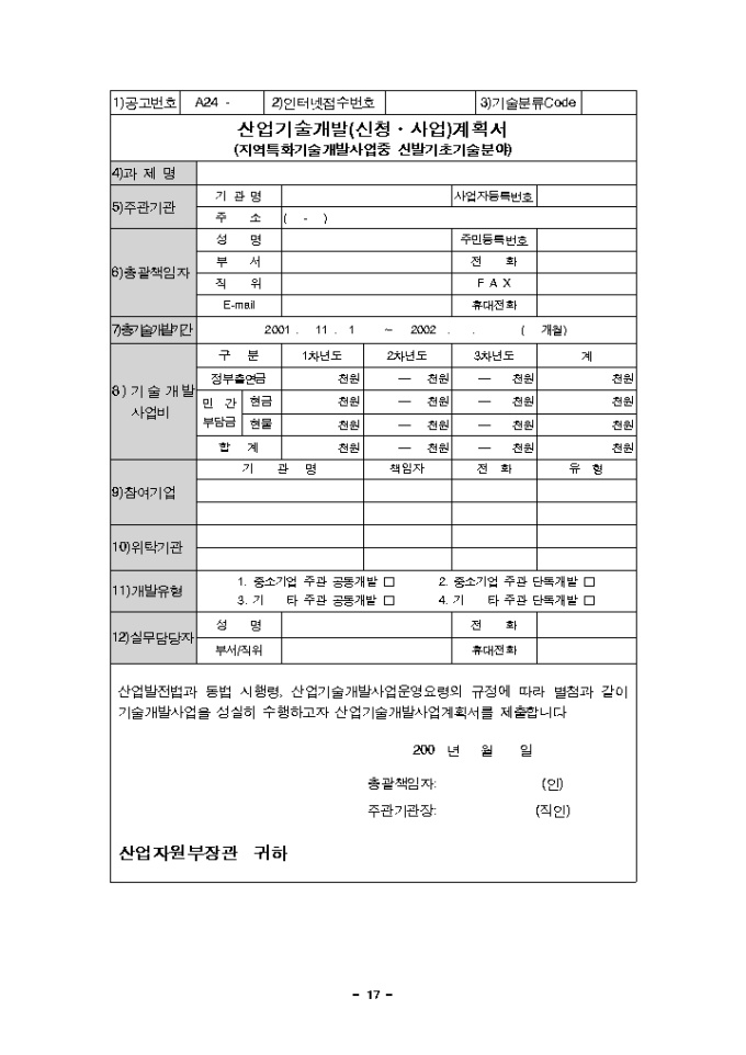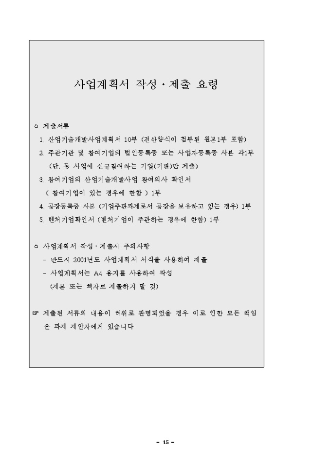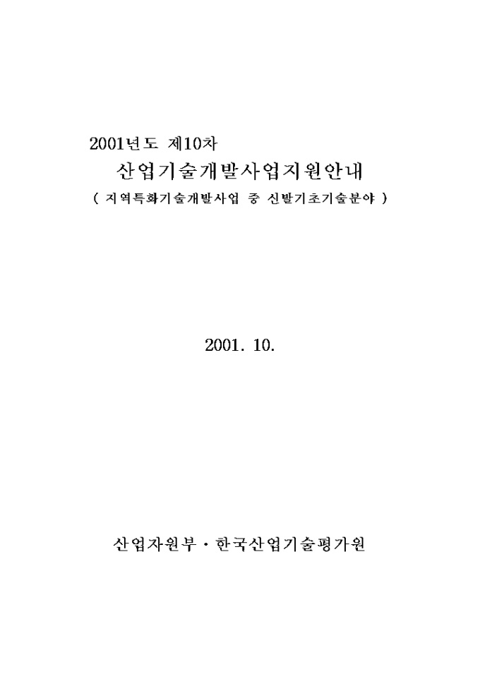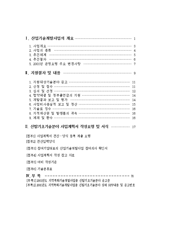 9,000원/월사업계획서(산업기술개발사업지원_신발기초분야) 양식입니다. [목 차] Ⅰ. 산업기술개발사업의 개요 1. 사업개요 2. 사업의 종류 3. 추진체계 4. 추진절차 5. 2001년 운영요령 주요 변경사항 Ⅱ. 지원절차 및 내용 1. 지원대상기술분야 공고 2. 신청 및 접수 3. 심의 및 선정 4. 협약체결 및 정부출연금의 지원 5. 개발결과 보고 및 평가 6. 사업비사용실적 보고 및 정산 7. 기술료 징수 8. 지적재산권 및 발생품의 귀속 9. 제재 및 환수 Ⅲ. 신발기초기술분야 사업계획서 작성요령 및 서식 [첨부1] 사업계획서 전산·양식 등록 제출 요령 [첨부2] 전산입력양식 [첨부3] 참여기업대표의 산업기술개발사업 참여의사 확인서 [첨부4] 사업계획서 작성 참고 자료 [첨부5] 여비 작성기준 [첨부6] 기술분류표 Ⅳ. 부 록 [부록1] 2001년도 지역특화기술개발사업중 신발기초기술분야 공고문 [부록2] 2001년도 지역특화기술개발사업중 신발기초기술분야 상세 RFP내용 및 공고번호
