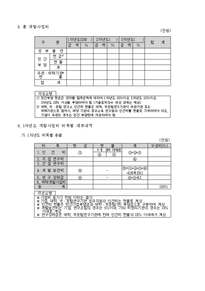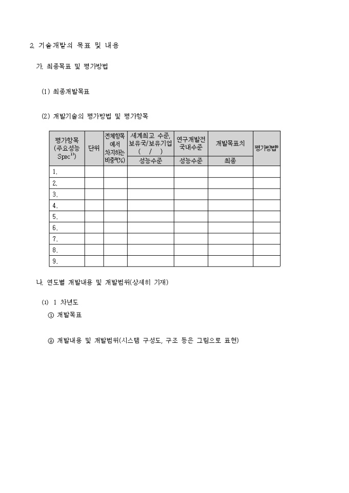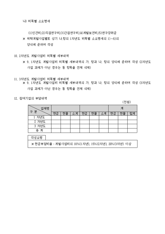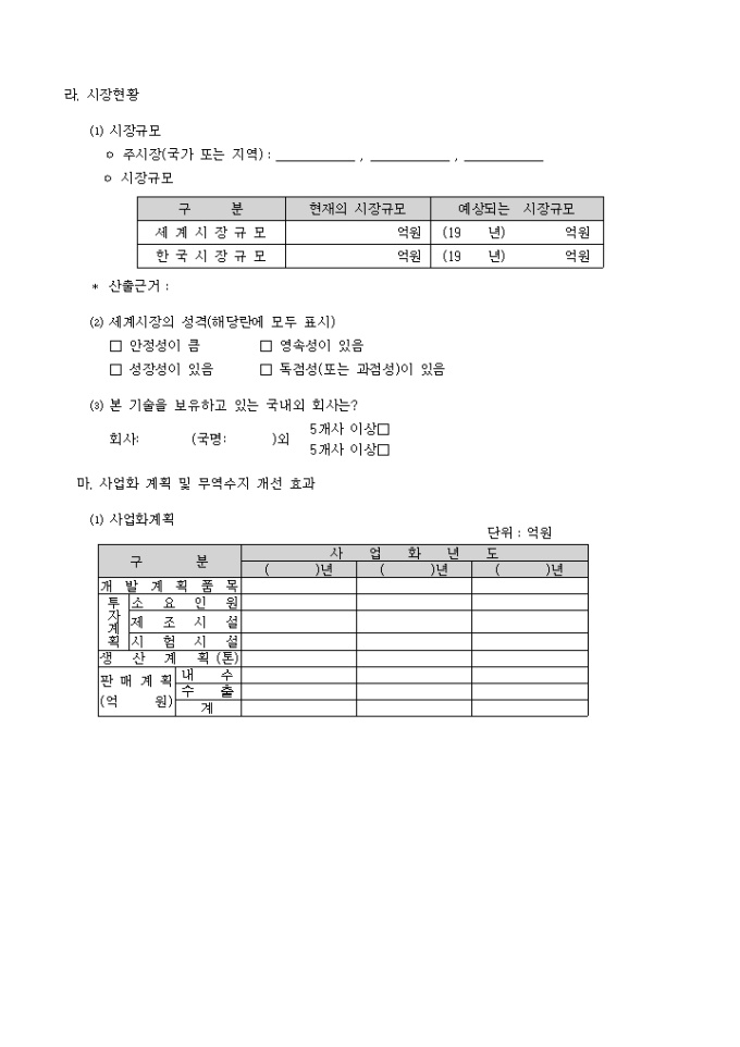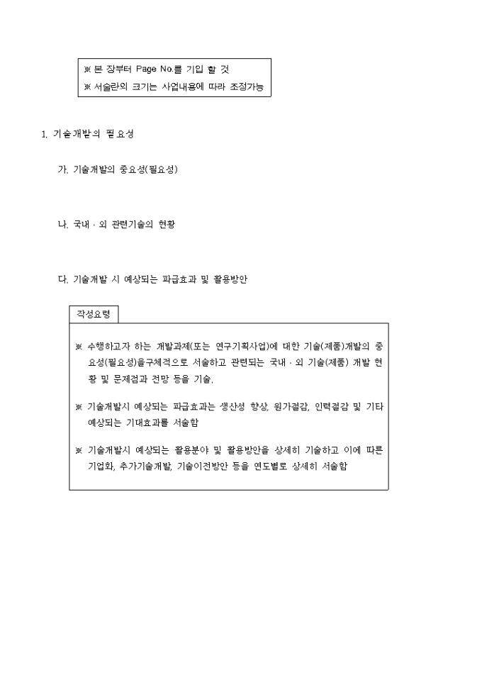 9,000원/월산업기반기술개발사업계획서 양식입니다. 산업발전법과 동법 시행령, 산업기반기술개발사업운영요령의 규정에 따라 별첨과 같이 기술개발사업을 성실히 수행하고자 산업기반기술개발사업계획서를 제출합니다. [첨 부] 1.산업기반기술개발사업계획서 10부(원본1부 포함) 2.주관기관 및 참여기업의 법인등록증 또는 사업자등록증 사본 각1부 3.참여기업의 산업기반기술개발사업 참여의사 확인서 각1부 4.공장등록증 사본(기업주관과제로서 공장을 보유하고 있는 경우)1부 5.벤처기업확인서(벤처기업이 주관하는 경우에 한함) 1부 6.「이달의 무역인상」 수상증명 사본 (수상자가 주관하는 경우에 한함) 1부 7.전산입력양식(인터넷 등록으로 갈음) 주 1) 주관기관이 기업인 경우 해당기업명 기입 및 대표자의 직인 날인 2) 사업내용에 따라 일부 수정 작성 가능 3) 주관기관이 기업일 경우 참여기업란에도 표기 4) 첨부 2는 동사업에 신규참여하는 기업(기관)만 제출 5) 사업계획서 총분량은 30페이지 이내에서 작성 (사업내용·기간, 위탁기관 등의 형태에 따라 10페이지 정도 추가할 수 있음)