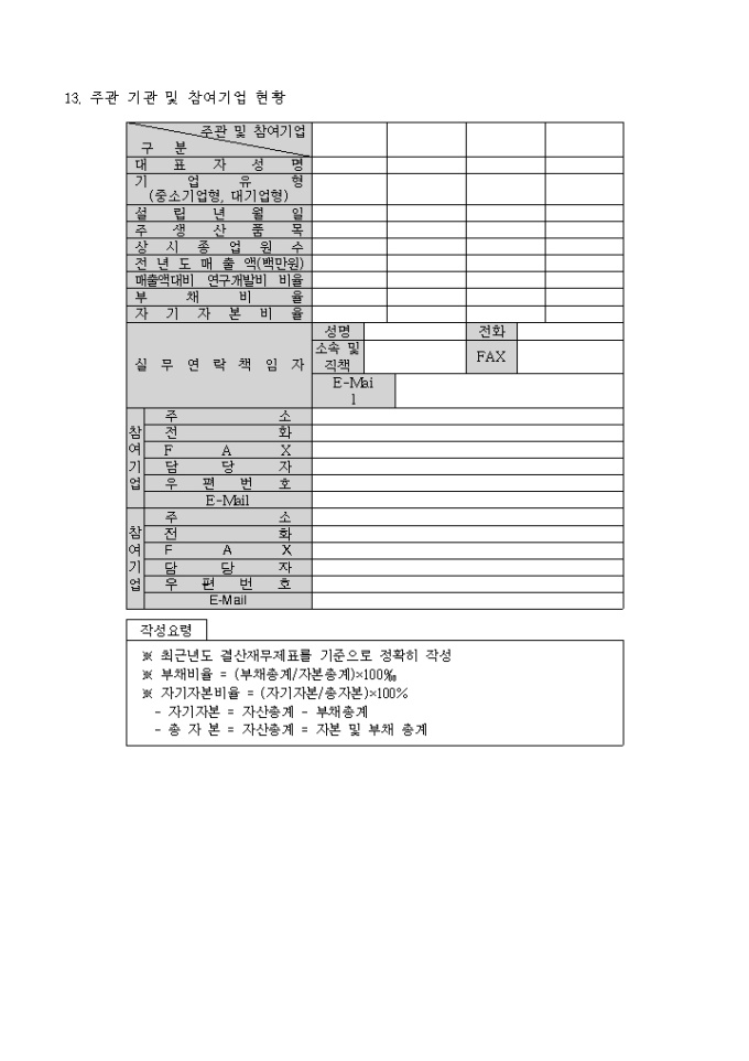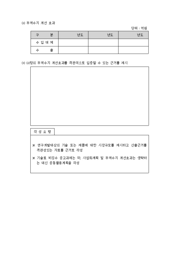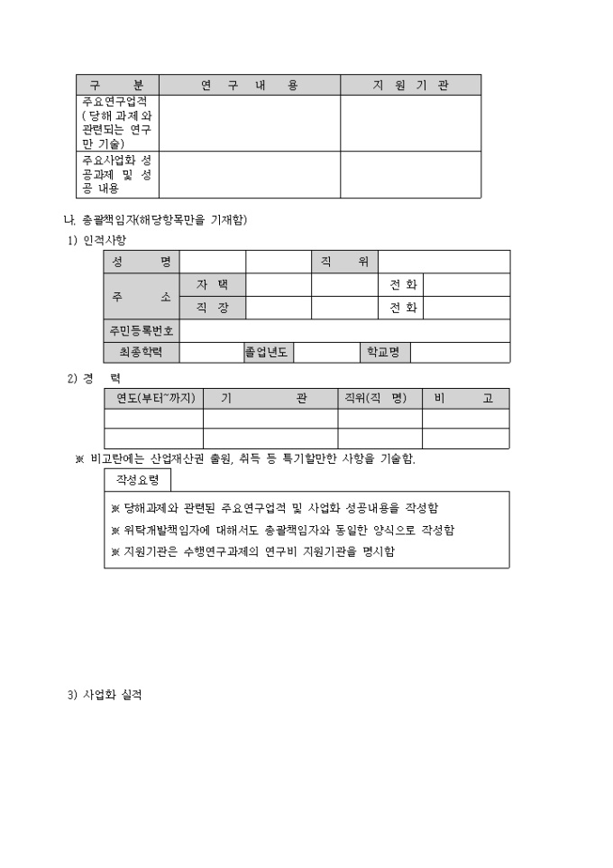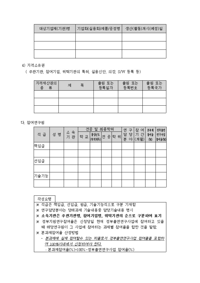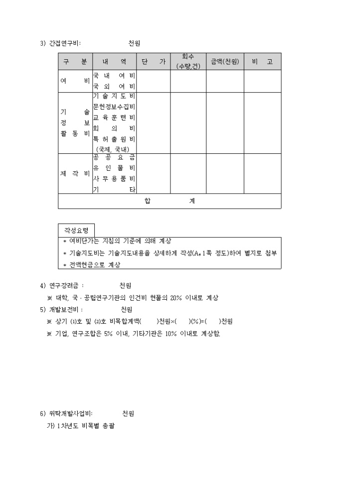 9,000원/월산업기반기술개발사업계획서 양식입니다. 산업발전법과 동법 시행령, 산업기반기술개발사업운영요령의 규정에 따라 별첨과 같이 기술개발사업을 성실히 수행하고자 산업기반기술개발사업계획서를 제출합니다. [첨 부] 1.산업기반기술개발사업계획서 10부(원본1부 포함) 2.주관기관 및 참여기업의 법인등록증 또는 사업자등록증 사본 각1부 3.참여기업의 산업기반기술개발사업 참여의사 확인서 각1부 4.공장등록증 사본(기업주관과제로서 공장을 보유하고 있는 경우)1부 5.벤처기업확인서(벤처기업이 주관하는 경우에 한함) 1부 6.「이달의 무역인상」 수상증명 사본 (수상자가 주관하는 경우에 한함) 1부 7.전산입력양식(인터넷 등록으로 갈음) 주 1) 주관기관이 기업인 경우 해당기업명 기입 및 대표자의 직인 날인 2) 사업내용에 따라 일부 수정 작성 가능 3) 주관기관이 기업일 경우 참여기업란에도 표기 4) 첨부 2는 동사업에 신규참여하는 기업(기관)만 제출 5) 사업계획서 총분량은 30페이지 이내에서 작성 (사업내용·기간, 위탁기관 등의 형태에 따라 10페이지 정도 추가할 수 있음)