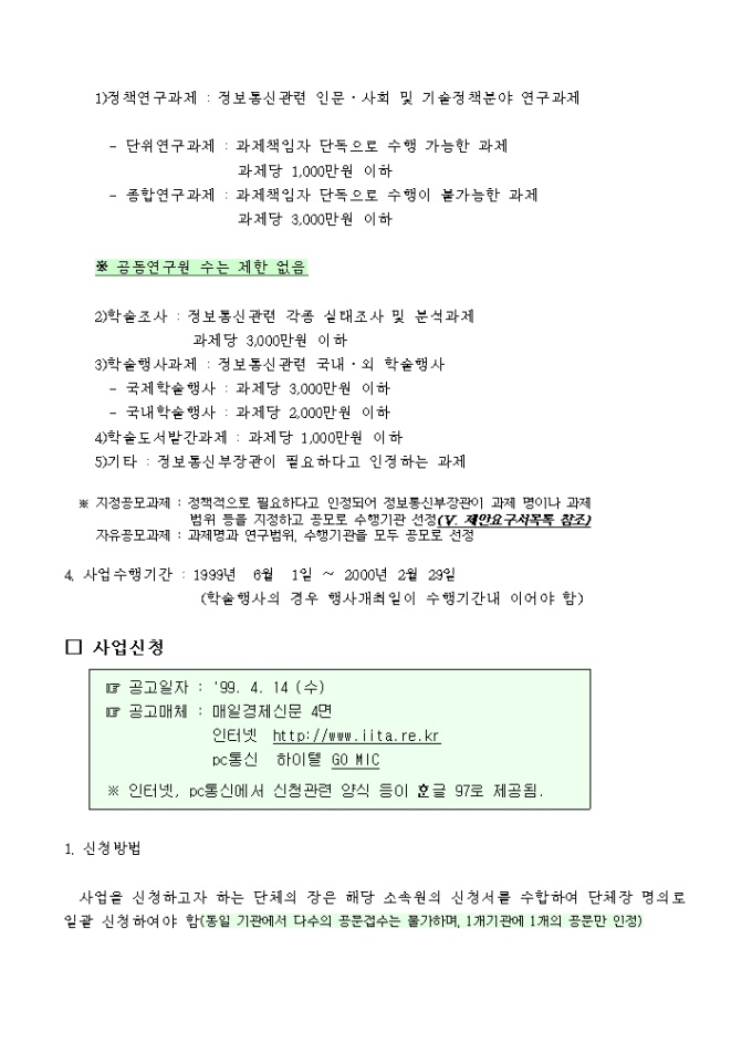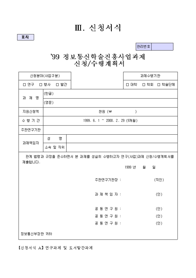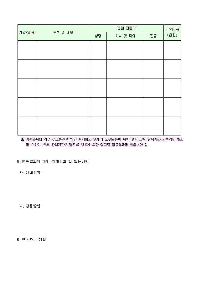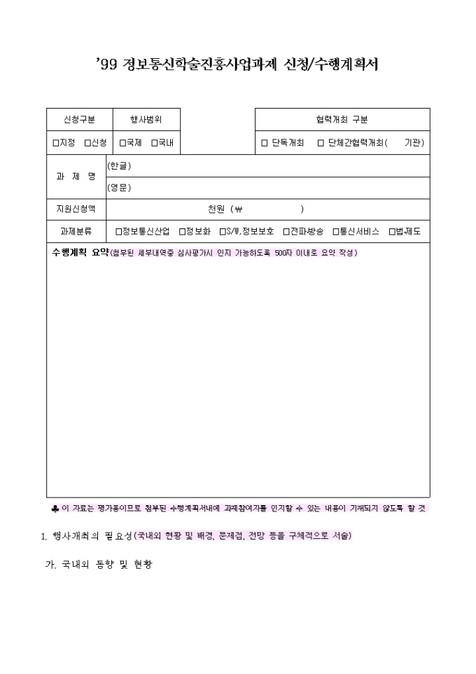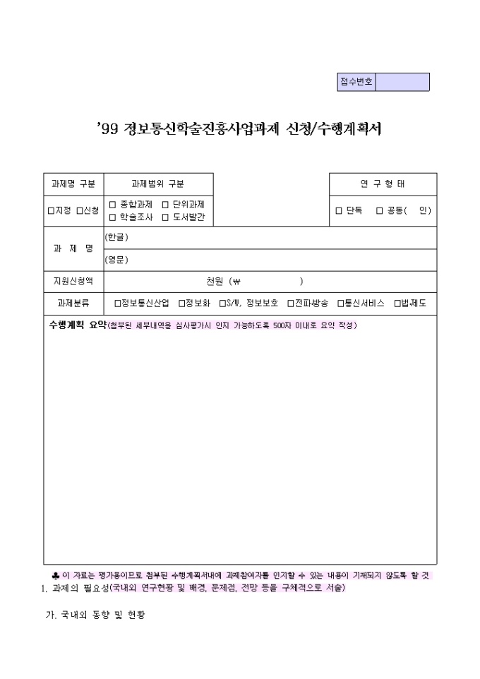 9,000원/월정보통신학술진흥사업과제수행계획서 양식입니다. [목 차] 1. 과제의 필요성 가. 국내외 동향 및 현황 나. 연구의 배경 및 전망 다. 기타 관련사항 2. 과제내용 및 범위 가. 연구목표 나. 연구내용 및 범위 3. 과제수행 방법 및 추진전략 4. 전문가 활용계획 5. 연구결과에 대한 기대효과 및 활용방안 가. 기대효과 나. 활용방안 6. 연구추진 계획 7. 연구분담표 8. 참고문헌 목록 9. 소요예산