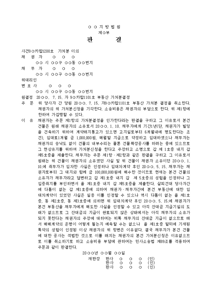 9,000원/월이의신청에 의한 가처분취소판결 예제 입니다. 주 문 위 당사자 간 당원 20 . 7. 15. 자9 카합1101호 부동산 가처분 결정을 취소한다. 채권자의 위 가처분신청을 기각한다. 소송비용은 채권자의 부담으로 한다. 위 제1항에 한하여 가집행할 수 있다. 이 유 채권자는 주문 제1항의 가처분결정을 인가한다라는 판결을 구하고 그 이유로서 본건 건물은 원래 채권자의 소유로서 20 . 1. 10. 채무자에게 기간1년(단, 채권자가 빌딩을 건축하기 위하여 계약해지통고가 있으면 고지일로부터 6개월내에 명도한다는 조건), 임대료1개월 ...