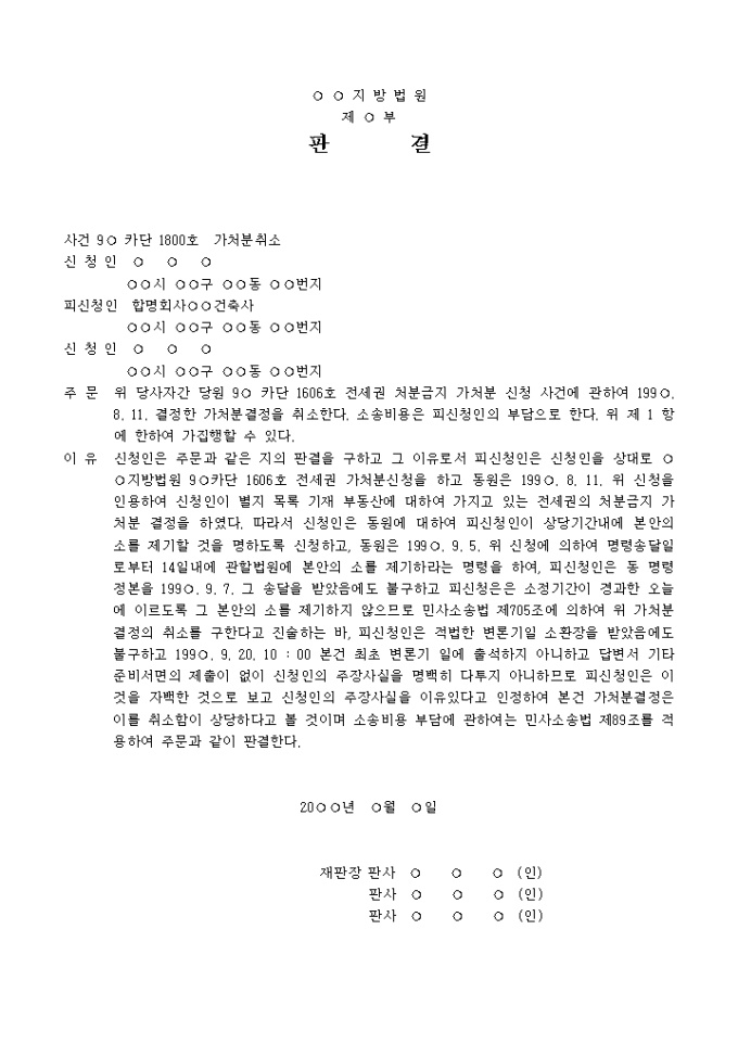 9,000원/월제소명령 불응을 이유로 한 가처분결정 취소판결서 예제 입니다. 주 문 위 당사자간 당원 9 카단 1606호 전세권 처분금지 가처분 신청 사건에 관하여 199 . 8. 11. 결정한 가처분결정을 취소한다. 소송비용은 피신청인의 부담으로 한다. 위 제 1 항에 한하여 가집행할 수 있다. 이 유 신청인은 주문과 같은 지의 판결을 구하고 그 이유로서 피신청인은 신청인을 상대로 지방법원 9 카단 1606호 전세권 가처분신청을 하고 동원은 199 . 8. 11. 위 신청을 인용하여 신청인이 별지 목록 기재 부동산에 대하여 가지고 있는 전세권의 처분금지 가처분 결정을 하였다. ...