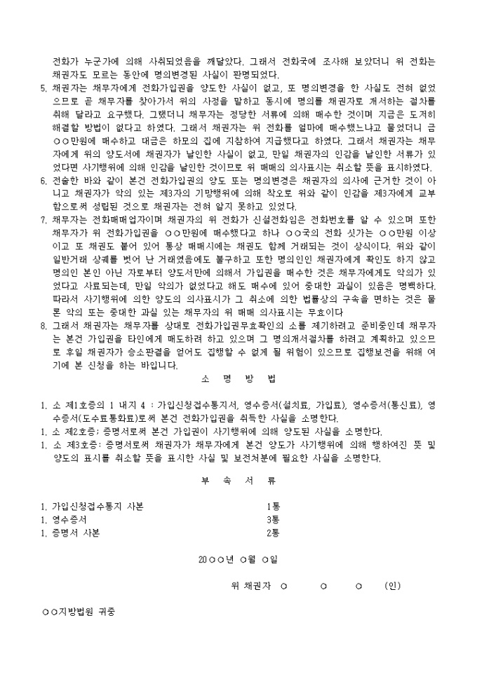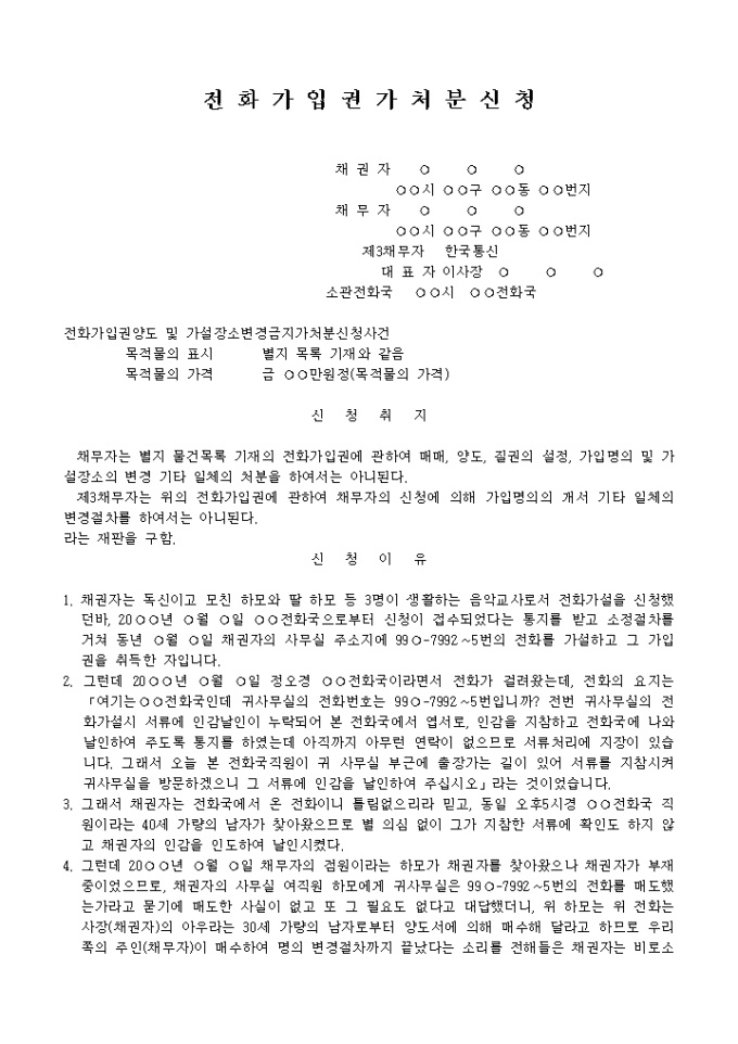 9,000원/월가입전화사용권의 양도,가설장소변경금지 가처분신청서(가입전화사용권 양도무효확인) 예제 입니다. 신 청 취 지 채무자는 별지 물건목록 기재의 전화가입권에 관하여 매매, 양도, 질권의 설정, 가입명의 및 가설장소의 변경 기타 일체의 처분을 하여서는 아니된다. 제3채무자는 위의 전화가입권에 관하여 채무자의 신청에 의해 가입명의의 개서 기타 일체의 변경절차를 하여서는 아니된다. 라는 재판을 구함. 신 청 이 유 1. 채권자는 독신이고 모친 하모와 딸 하모 등 3명이 생활하는 음악교사로서 전화가설을 신청했던바, 20 년 월 일 전화국으로부터 신청이 접수되었다는 통지를 받고 소정절차를 거쳐 동년 월 일 채권자의 사무실 주소지에 99 -7992∼5번의 전화를 가설하고 그 가입권을 취득한 자입니다. ...