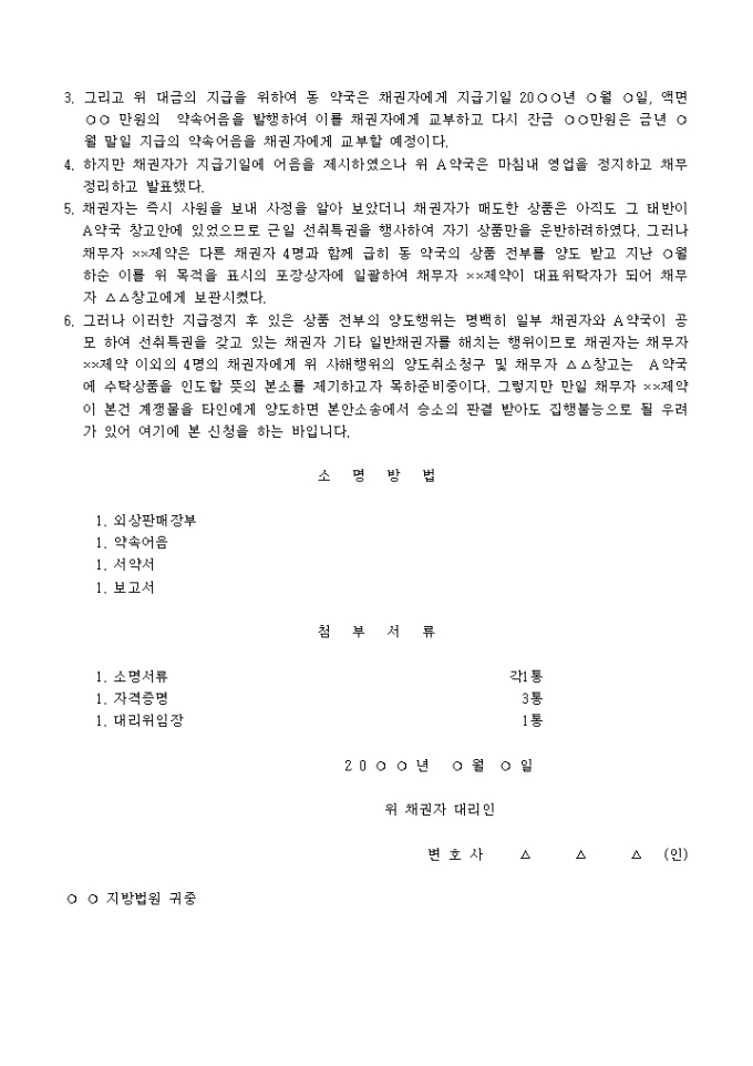 9,000원/월약품의 양도,질입,기타 일체의 처분금지 및 인도금지 가처분신청서 예제 입니다. 신 청 취 지 채무자는 제약회사는 위의 물건을 양도, 질입 기타 일체의 처분을 하여서는 아니된다. 채무자의 창고주식회사는 그 보관하고 있는 위 물건을 채무자 주식회사 또는 그 지시인에게 인도하여서는 아니된다. 라는 재판을 구함. 신 청 이 유 1. 채권자 및 채무자 제약주식회사(이하 제약이라 칭한다)는 모두 의료약품의 제조판매를 업으로 하는 자이며, 또 채무자 창고주식회사(이하 창고라 한다)는 시 구에서 창고업을 영위하는 회사이다. ...