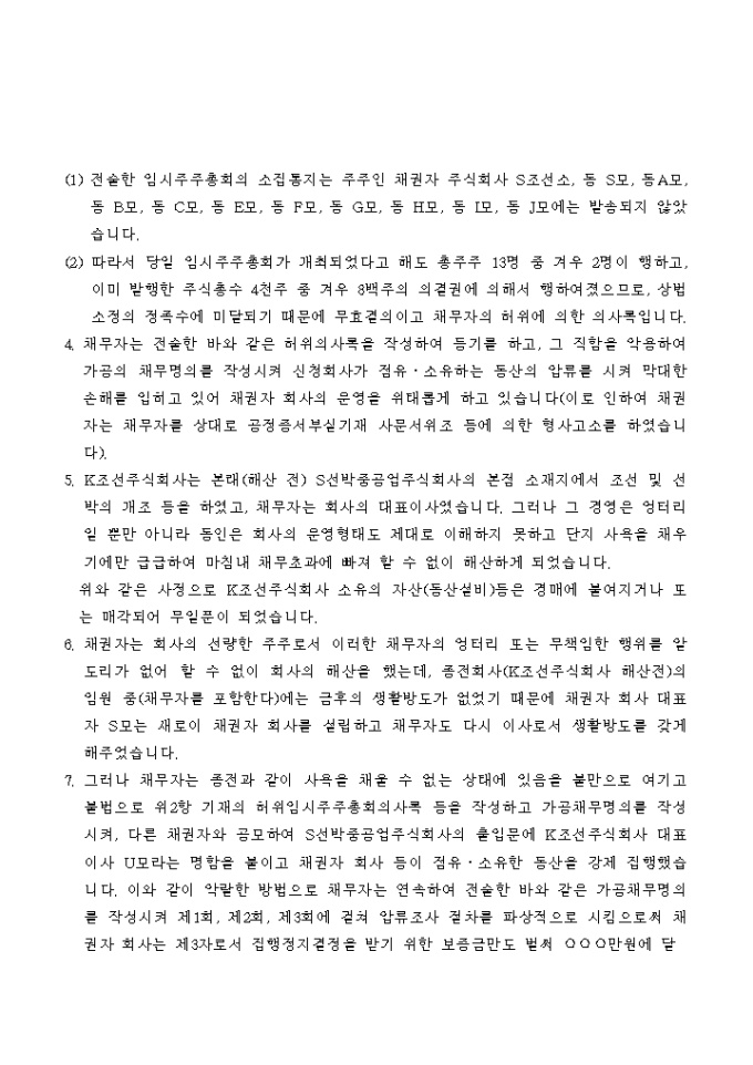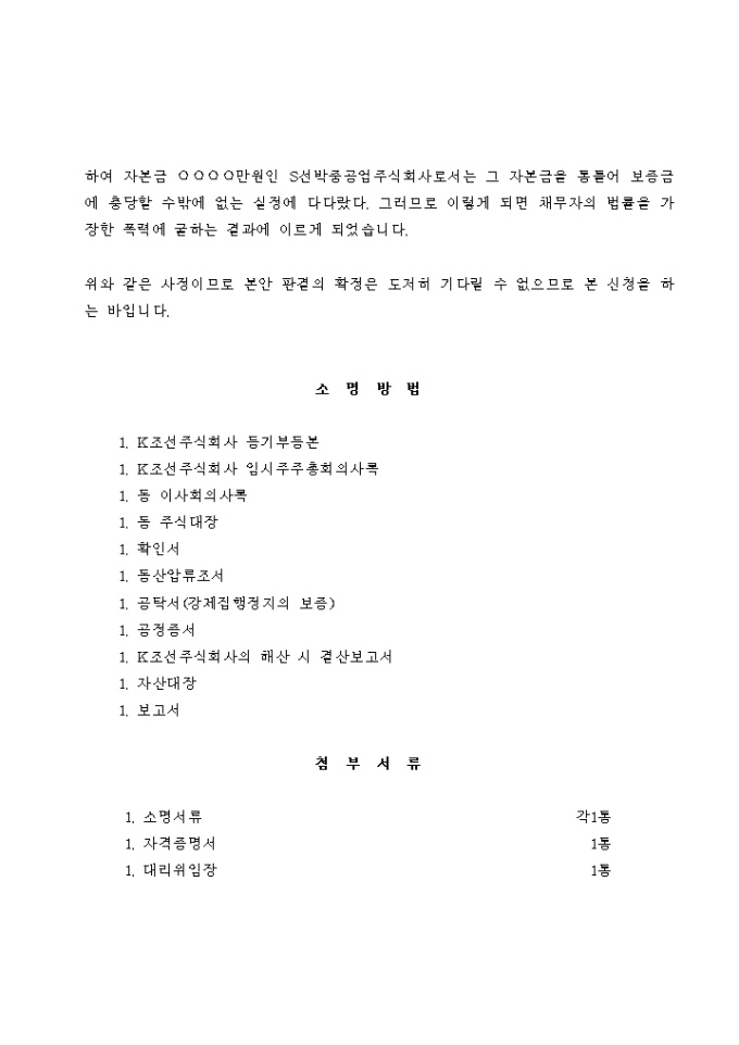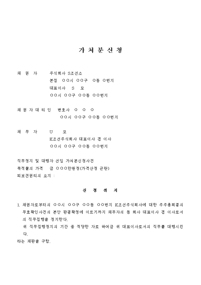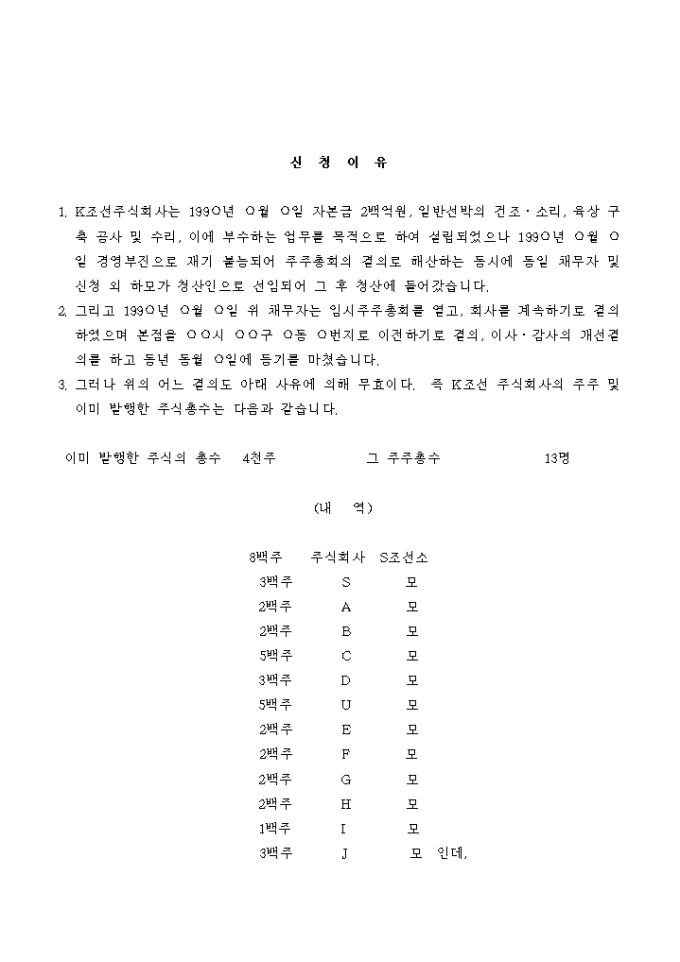 9,000원/월주식회사 대표이사 겸 이사의 직무집행정지 및 위 동 직무대행자선임 가처분신청서(주주총회결의 무효확인청구) 예제 입니다. 신 청 취 지 채권자로부터의 ○○시 ○○구 ○○동 ○○번지 K조선주식회사에 대한 주주총회결의무효확인사건의 본안판결확정에 이르기까지 체무자의 동 회사 대표이사 겸 이사로서의 직무집행을 정지한다. 위 직무집행정지의 기간중 적당한 자로 하여금 위 대표이사로서의 직무를 대행시킨다. 라는 재판을 구함. 신 청 이 유 1. K조선주식회사는 199○년 ○월 ○일 자본금 2백억원, 일반선박의 건조․소리, 육상 구축 공사 및 수리, 이에 부수하는 업무를 목적으로 하여 설립되었으나 199○년 ○월 ○일 경영부진으로 재기불능되어 주주총회의 결의로 해산하는 동시에 동일 채무자 및 신청외 하모가 청산인으로 선임되어 그 후 청산에 들어갔다. ...