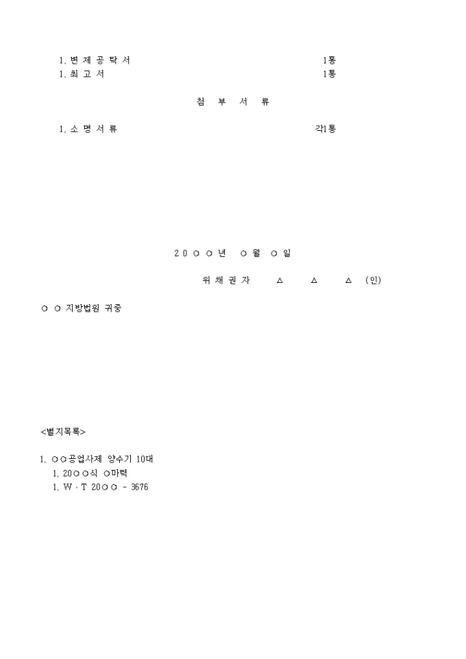 9,000원/월집달관보관 채권자사용 가처분신청서 예제 입니다. 신 청 취 지 채무자는 별지 목록 기재 물건에 대한 점유를 해제하고 채권자가 위임하는 집달관에게 그 보관을 명한다. 집달관은 현상을 변경하지 않을 것을 조건으로 이를 채권자로 하여금 보관 사용하게 할 수 있다. 라는 재판을 구함. 신 청 이 유 1. 채권자는 20○○년 ○월 ○일 채무자로부터 금 5,000,000원 차용하고 이자약정없이 변제기일 20○○년 ○월 ○○일로 약정하고 채권자 소유의 별지 목록 기재 양수기 10대를 양도담보조로 채무자에게 신탁 양도하고 채권자가 위 변제기일에 위 차용금을 변 제함과 동시에 위 양수기는 채권자에 반환하기로 약정하였다. ...