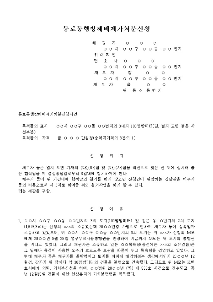 9,000원/월통로통행장애물(함석담)철거 가처분신청서(통행권확인) 예제 입니다. 신 청 취 지 채무자 등은 별지 도면 기재의 (다),(바)점 및 (바),(사)점을 직선으로 맺은 선 위에 설치해 놓은 함석담을 이 결정송달일로부터 3일내에 철거하여야 한다. 채무자 등이 위 기간내에 함석담의 철거를 하지 않으면 신청인이 위임하는 집달관은 채무자 등의 비용으로써 제 3자로 하여금 위의 철거작업을 하게 할 수 있다. 라는 재판을 구함. 신 청 이 유 1. 시 구 동 번지의 3의 토지(100평방미터) 및 같은 동 번지의 2의 토지(1,615.3㎡)는 신청외 의 소유였는데 20 년경 사망으로 인하여 채무자 등이 상속받아 소유하고 있었으며, 위 시 구 동 번지의 3의 토지는 위 가 신청외 M모에게 20 년 8월 28일 영구무료사용통행권을 인정하여 지금까지 M모는 위 토지의 통행권을 지니고 있었다. ...