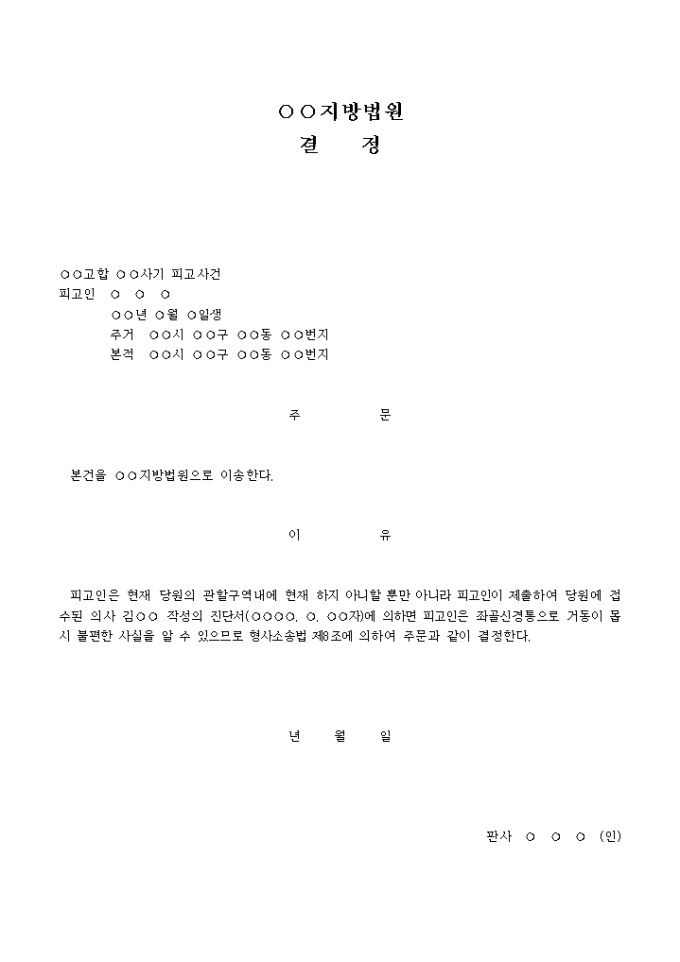 9,000원/월사건의직권이송결정 입니다. 이 유 피고인은 현재 당원의 관할구역내에 현재 하지 아니할 뿐만 아니라 피고인이 제출하여 당원에 접수된 의사 김 작성의 진단서( . . 자)에 의하면 피고인은 좌골신경통으로 거동이 몹시 불편한 사실을 알 수 있으므로 형사소송법 제8조에 의하여 주문과 같이 결정한다. ...