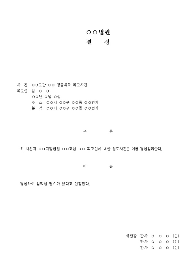9,000원/월사물관할의병합심리결정(토지관할을달리할때) 입니다. 주 문 위 사건과 지방법원 고합 피고인에 대한 절도사건은 이를 병합심리한다. 이 유 병합하여 심리할 필요가 있다고 인정된다. ...