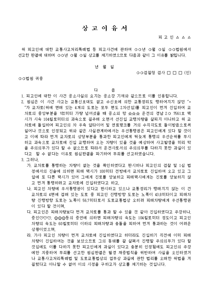 9,000원/월상고이유서(검사)(8) 예제 입니다. 1. 피고인에 대한 이 사건 공소사실의 요지는 공소장 기재와 같으므로 이를 인용합니다. 2. 원심은 이 사건 사고는 교통신호대도 없고 수신호에 의한 교통정리도 행하여 지지 않던 +자 교차로(위에 면해 있는 4개의 도로는 모두 편도 2차선임)를 피고인이 먼저 진입하여 교차로의 중앙부분을 약2미터 가량 넘어섰을 때 공소외 망 ☆☆☆ 운전의 경남 2 7561호 택시가 시속 104킬로미터의 과속으로 질주해 오면서