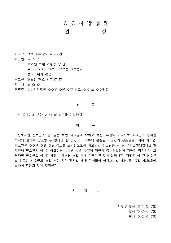 9,000원/월원심법원의상고기각결정 입니다. 주 문 위 피고인에 대한 변호인의 상고를 기각한다. 이 유 변호사인 변호인의 상소권은 독립 대리권에 속하고 독립고유권이 아니므로 피고인의 명시한 의사에 반하여 상고할 수 없다고 할 것인 바, 기록에 편철된 피고인의 상소권포기서에 의하면, 피고인은 ○○년 ○월 ○일 상소를 포기함으로 써 피고인의 상소권은 위 일시에 소멸되었다고 할 ...