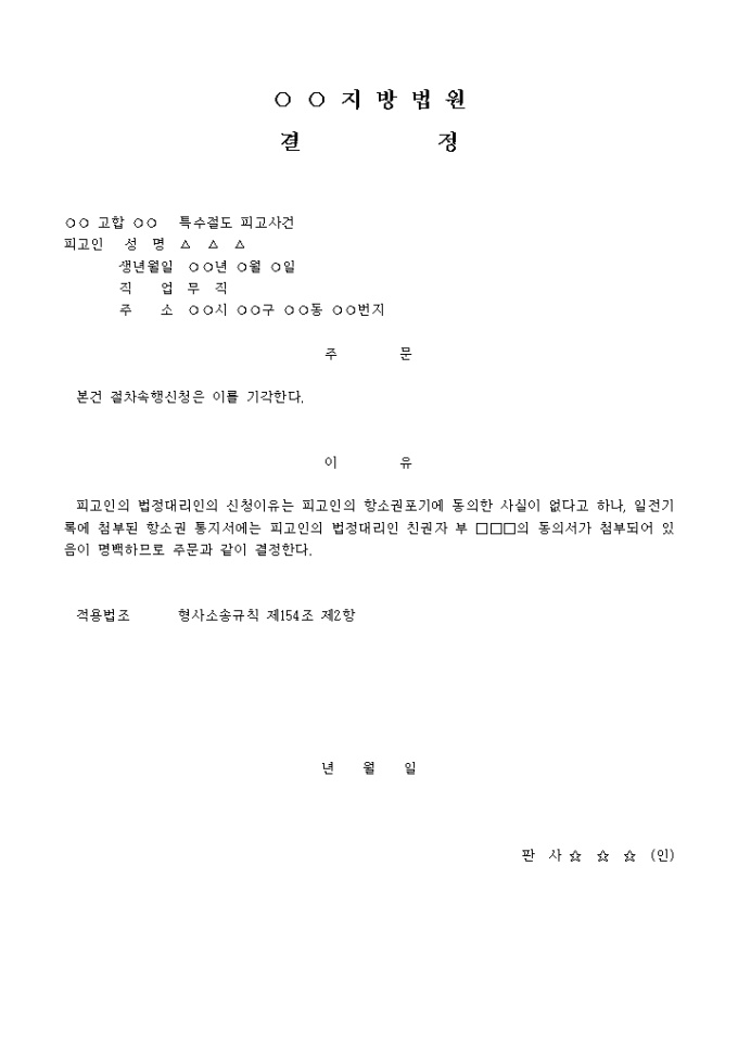9,000원/월절차속행신청포기결정 입니다. 주 문 본건 절차속행신청은 이를 기각한다. 이 유 피고인의 법정대리인의 신청이유는 피고인의 항소권포기에 동의한 사실이 없다고 하나, 일전기록에 첨부된 항소권 통지서에는 피고인의 법정대리인 친권자 부 □□□의 동의서가 첨부되어 있음이 명백하므로 주문과 같이 결정한다. ...