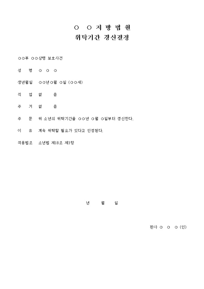 9,000원/월위탁기간경신결정 입니다. 주 문 위 소년의 위탁기간을 ○○년 ○월 ○일부터 경신한다. 이 유 계속 위탁할 필요가 있다고 인정된다. 적용법조 소년법 제18조 제3항 ...