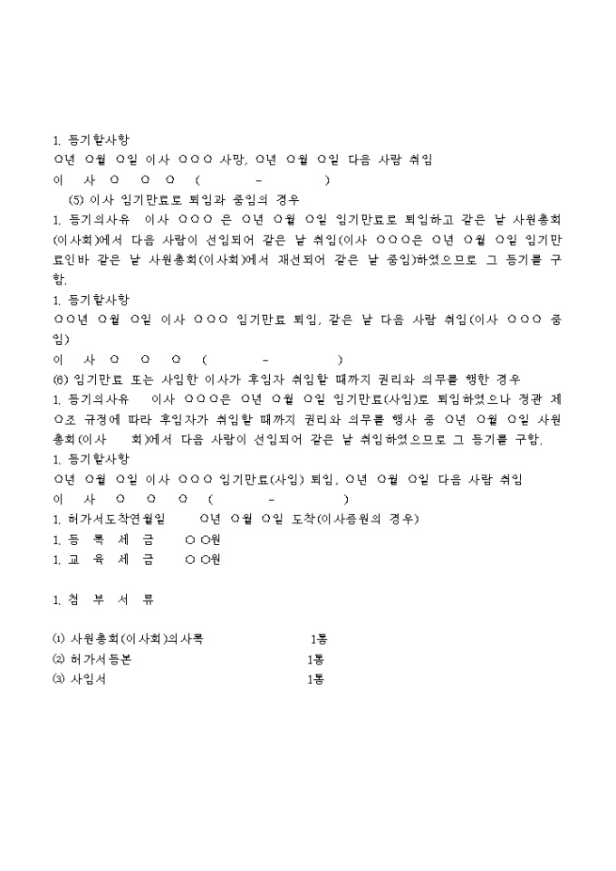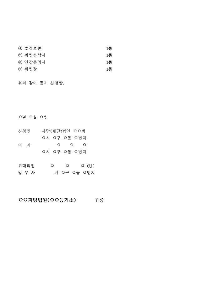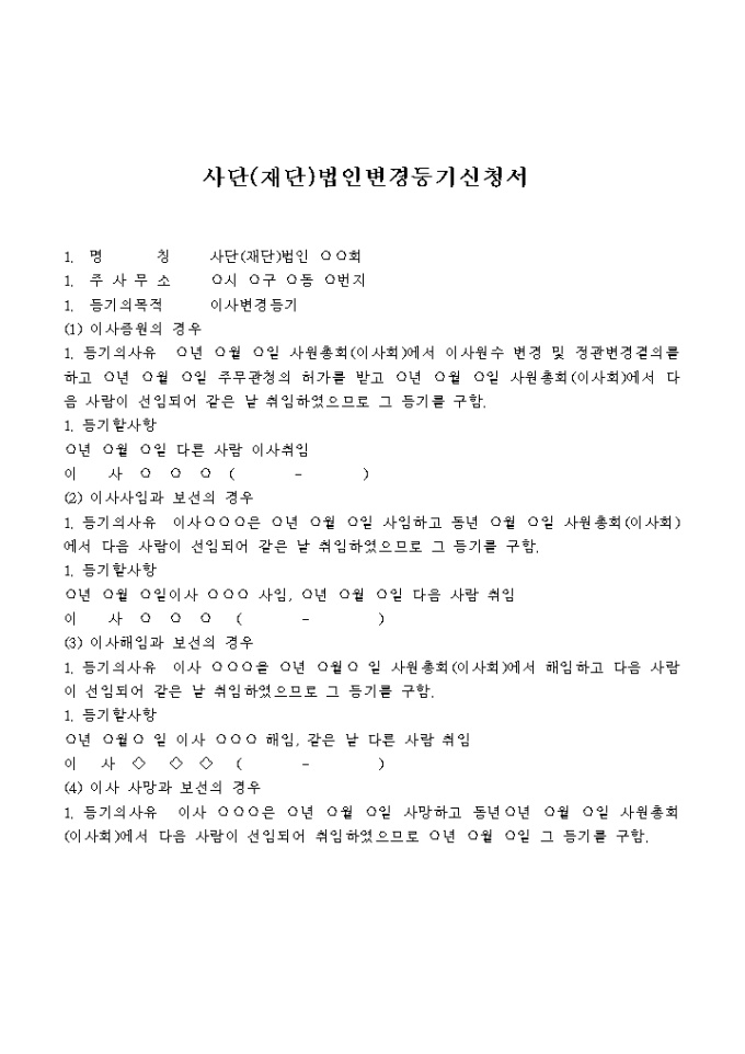 9,000원/월이사변경을 위한 사단(재단)법인변경등기신청서양식입니다. 명칭, 주사무소, 등기의 목적, 등기의 사유, 등기할 사항등으로 구성되어 있습니다.