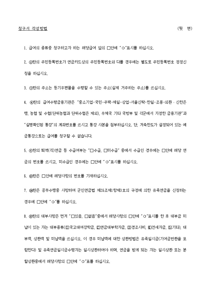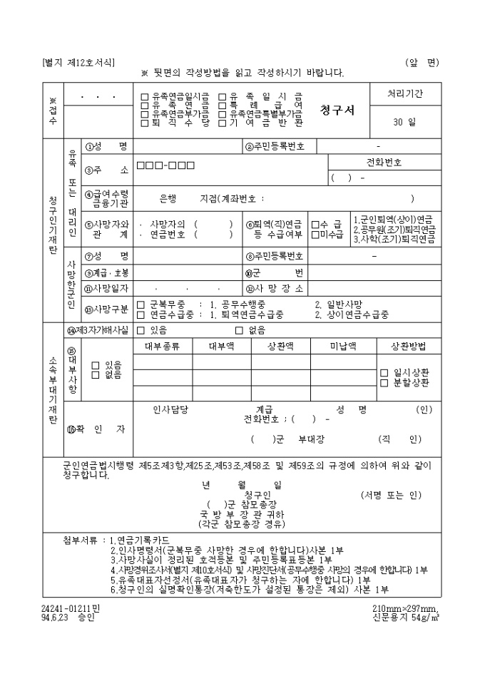 9,000원/월군인연금법시행령 제5조제3항,제25조,제53조,제58조 및 제59조의 규정에 의하여 유족 연금(일시, 부가, 특별부과)금, 퇴직수당, 유족일시금, 특례급여, 기여급반환을 청구하고자 할 때 사용하는 '유족연금(일시, 부가, 특별부과)금,퇴직수당,유족 일시금,특례 급여,기여급 반환 청구서' 양식입니다.