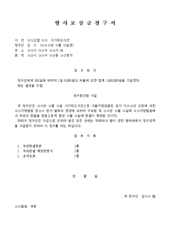 9,000원/월형사보상금청구서 입니다. 청 구 취 지 청구인에게 200일에 대하여 1일 8, 000원의 비율에 의한 합계 1, 600, 000원을 지급한다. 라는 결정을 구함. 청구원인된 사실 위 청구인은 년 월 일 사기피고사건으로 서울지방검찰청 검사 이 의 신청에 의한 지방법원 정 판사 발부의 영장에 의하여 구속된 후 년 월 일에 지방법원에서 무죄의 판결을 받음으로 써 동년 월 일에 판결이 확정된 것이다. 따라서
