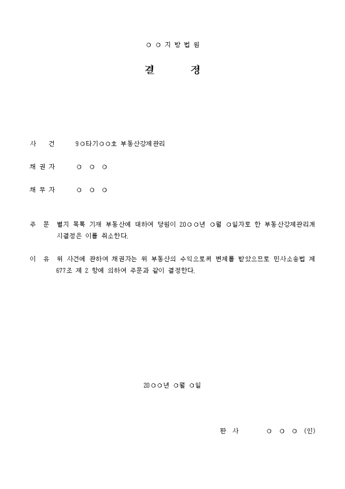 9,000원/월채권자 만족에 의한 강제관리취소(동 강제관리취소결정서) 입니다. 주 문 별지 목록 기재 부동산에 대하여 당원이 20 년 월 일자로 한 부동산강제관리개시결정은 이를 취소한다. 이 유 위 사건에 관하여 채권자는 위 부동산의 수익으로써 변제를 받았으므로 민사소송법 제677조 제 2 항에 의하여 주문과 같이 결정한다. ...