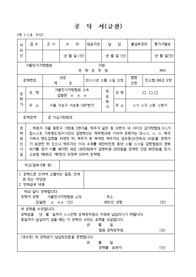 9,000원/월집행목적물 아닌 동산의 경매매득금공탁서 입니다. 채권자 서울 종로구 가회동 5번지을, 채무자 같은 동 10번지 내 사이의 갑지방법원 9○가합○○호 가옥명도청구사건의 집행력있는 채무명의에 기하여 공탁자는 20○○. ○. ○. 목적가옥의 명도집행을 하였던 바, 채무자 등 부재로 채무자의 점유동산(전축외 10점)을 공탁자가 보관한 바 있으나 채무자는 이의 수취를 태만하므로 동년 ○월 ○○일 집행법원의 경매허가를 얻어 이를 매각한 대금 100만원에서 집행비용 20만원을 공제한 잔금 80만원을 민사소송법 제690조 제6항의 규정에 의하여 공탁함. ...