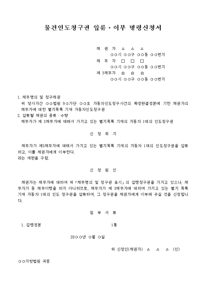 9,000원/월물건인도청구권압류·이부명령신청서 예제 입니다. 신 청 취 지 채무자가 제3채무자에 대해서 가지고 있는 별지목록 기재의 자동차 1대의 인도청구권을 압류하고, 이를 채권자에게 이부한다. 라는 재판을 구함. 신 청 원 인 채권자는 채무자에 대하여 위「채무명의 및 청구권 표시」의 집행청구권을 가지고 있으나 , 채무자가 동 채무이행을 하지 아니하므로, 채무자가 제 3채무자에 대하여 가지고 있는 별지 목록 기재 자동차 1대의