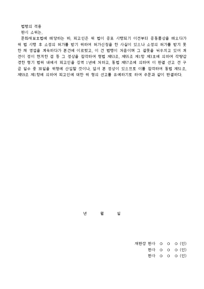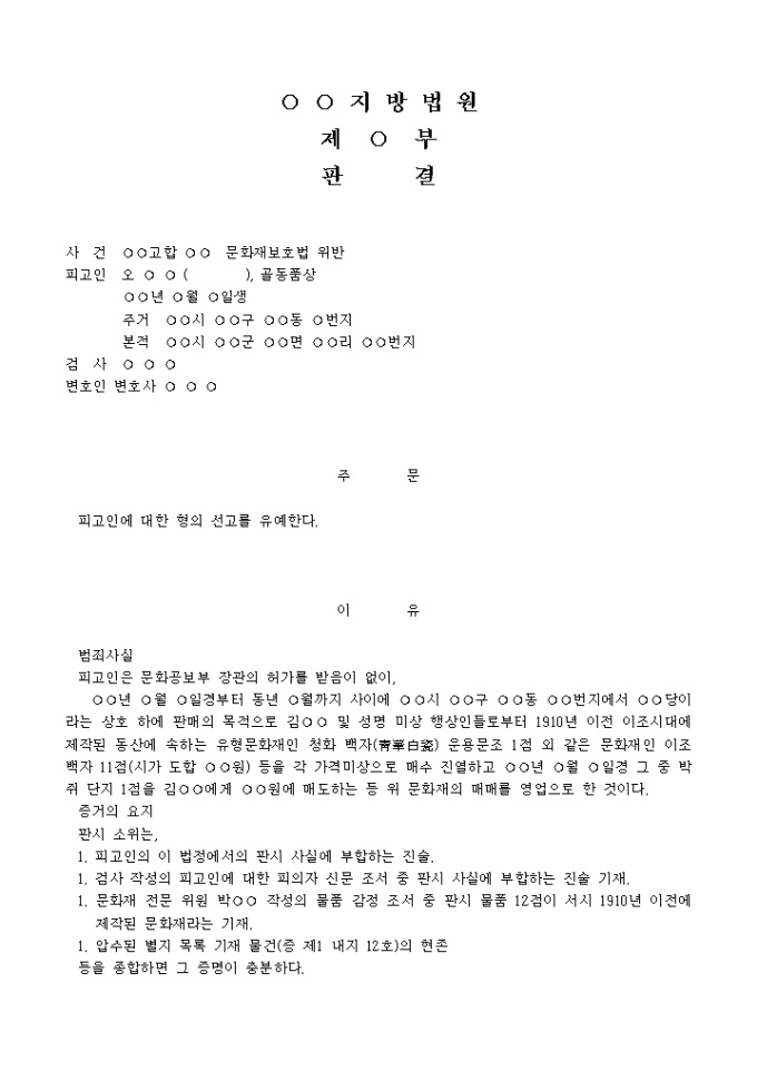 9,000원/월판결문(문화재보호법위반→선고유예) 예제 입니다. 주 문 피고인에 대한 형의 선고를 유예한다. 이 유 범죄사실 피고인은 문화공보부 장관의 허가를 받음이 없이, ○○년 ○월 ○일경부터 동년 ○월까지 사 이에 ○○시 ○○구 ○○동 ○○번지에서 ○○당이라는 상호 하에 판매의 목적으로 김○○ 및 성명 미상 행상인들로부터 1910년 이전 이조시대에 제작된 동산에 속하는 유형문화재인 청화 백자(靑華白瓷) 운용문조