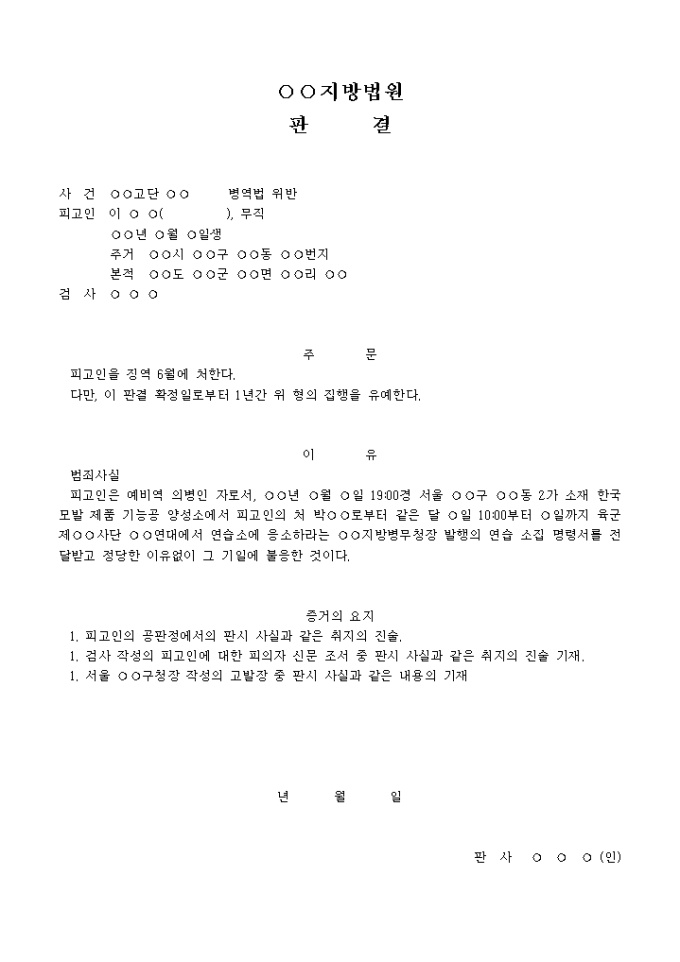 9,000원/월판결문(병역법 위반→집행유예)-1 예제 입니다. 주 문 피고인을 징역 6월에 처한다. 다만, 이 판결 확정일로부터 1년간 위 형의 집행을 유예한다. 이 유 범죄사실 피고인은 예비역 의병인 자로서, 년 월 일 19:00경 서울 구 동 2가 소재 한국 모발 제품 기능공 양성소에서 피고인의 처 박 로부터 같은 달 일 10:00부터 일까지 육군 제 사단 연대에서 연습소에 응소하라는 지방병무청장 발행의 연습 소집 명령서를 전달받고 정당한 이유없이 그 기일에 불응한 것이다. ...