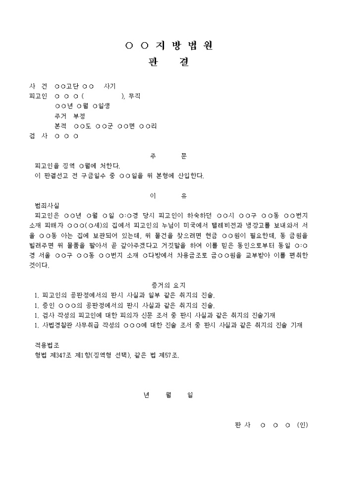 9,000원/월판결문(사기→징역)(1) 예제 입니다. 주 문 피고인을 징역 월에 처한다. 이 판결선고 전 구금일수 중 일을 위 본형에 산입한다. 이 유 범죄사실 피고인은 년 월 일 : 경 당시 피고인이 하숙하던 시 구 동 번지 소재 피해자 ( 세)의 집에서 피고인의 누님이 미국에서 텔레비전과 냉장고를 보내와서 서울 동 아는 집에 보관되어 있는데, ...