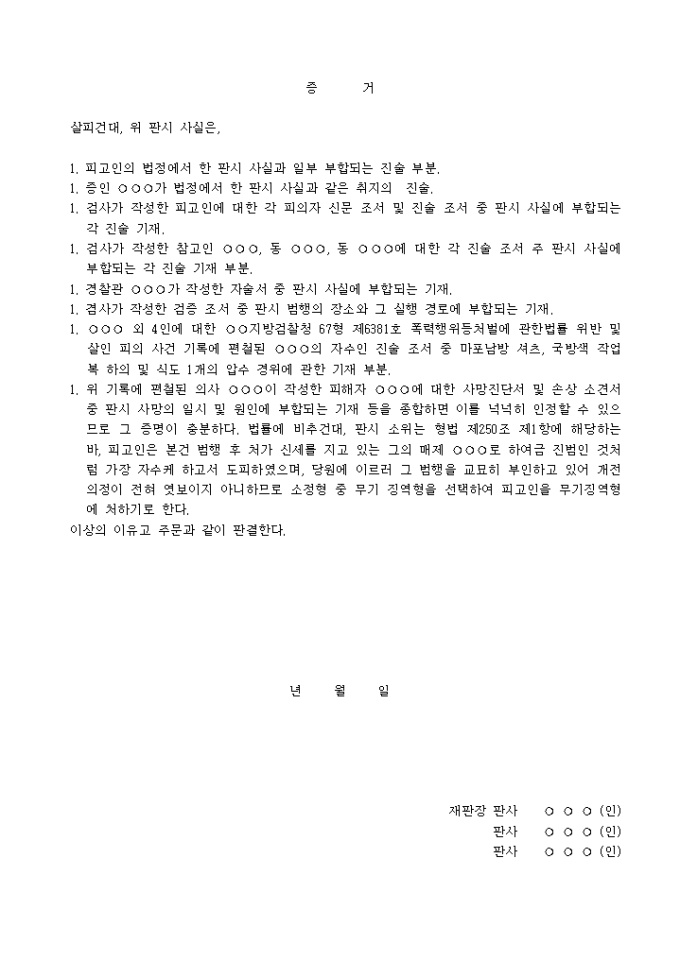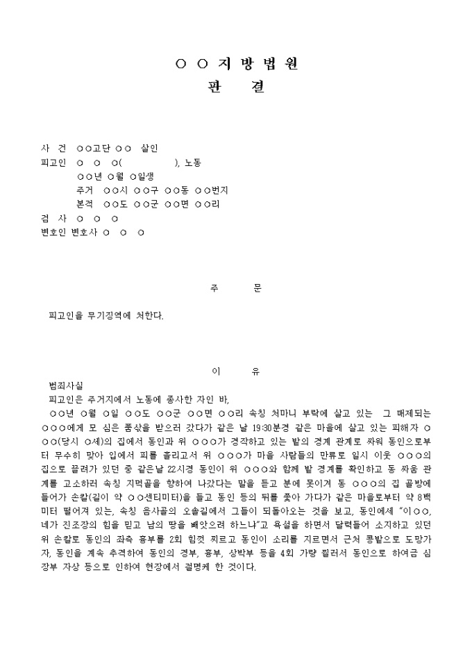9,000원/월판결문(살인→무기징역) 예제 입니다. 주 문 피고인을 무기징역에 처한다. 이 유 범죄사실 피고인은 주거지에서 노동에 종사한 자인 바, 년 월 일 도 군 면 리 속칭 처마니 부락에 살고 있는 그 매제되는 에게 모 심은 품삯을 받으러 갔다가 같은 날 19:30분경 같은 마을에 살고 있는 피해자 (당시 세)의 집에서 동인과 위 가 경작하고 있는 밭의 경계 관계로 싸워