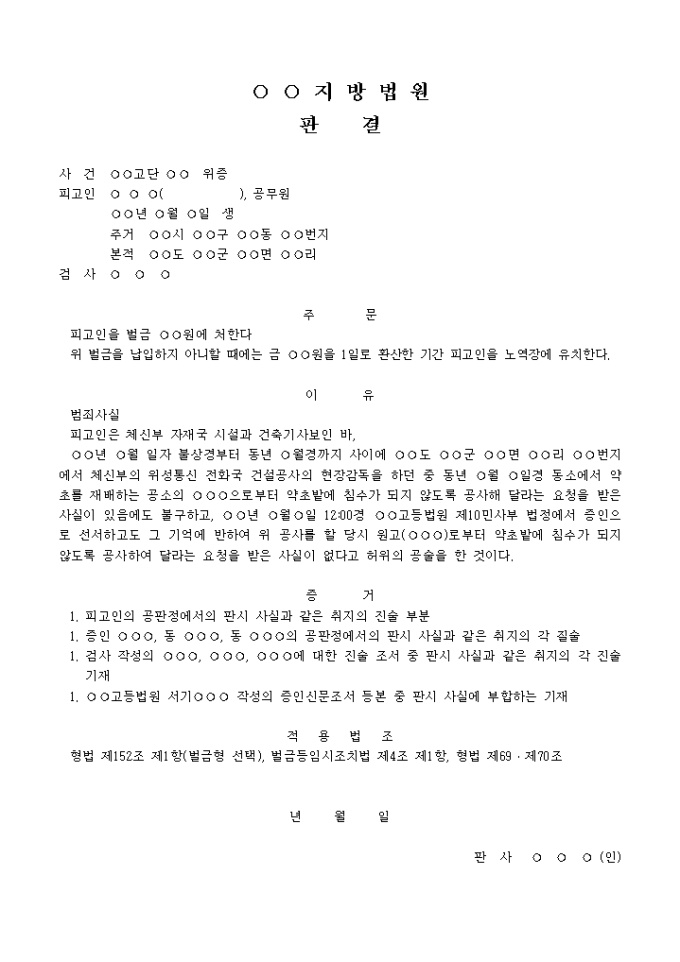 9,000원/월판결문(위증→벌금) 예제 입니다. 주 문 피고인을 벌금 원에 처한다 위 벌금을 납입하지 아니할 때에는 금 원을 1일로 환산한 기간 피고인을 노역장에 유치한다. 이 유 범죄사실 피고인은 체신부 자재국 시설과 건축기사보인 바, 년 월 일자 불상경부터 동년 월경까지 사 이에 도 군 면 리 번지에서 체신부의 위성통신 전화국 건설공사의 현장감독을 하던 중 동년 월 일경 동소에서 약초를