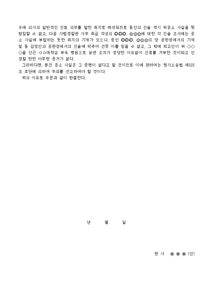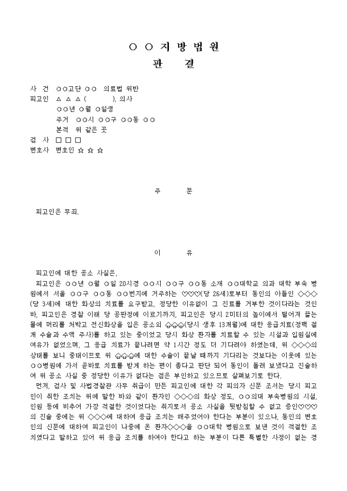 9,000원/월판결문(의료법위반→무죄) 예제 입니다. 주 문 피고인은 무죄. 이 유 피고인에 대한 공소 사실은, 피고인은 년 월 일 20시경 시 구 동 소재 대학교 의과 대학 부속 병원에서 서울 구 동 번지에 거주하는 ♡♡♡(당 26세)로부터 동인의 아들인 (당 3세)에 대한 화상의 치료를 요구받고, 정당한 이유없이 그 진료를 거부한 것이다라는 것인 바, 피고인은 경찰 이래 당