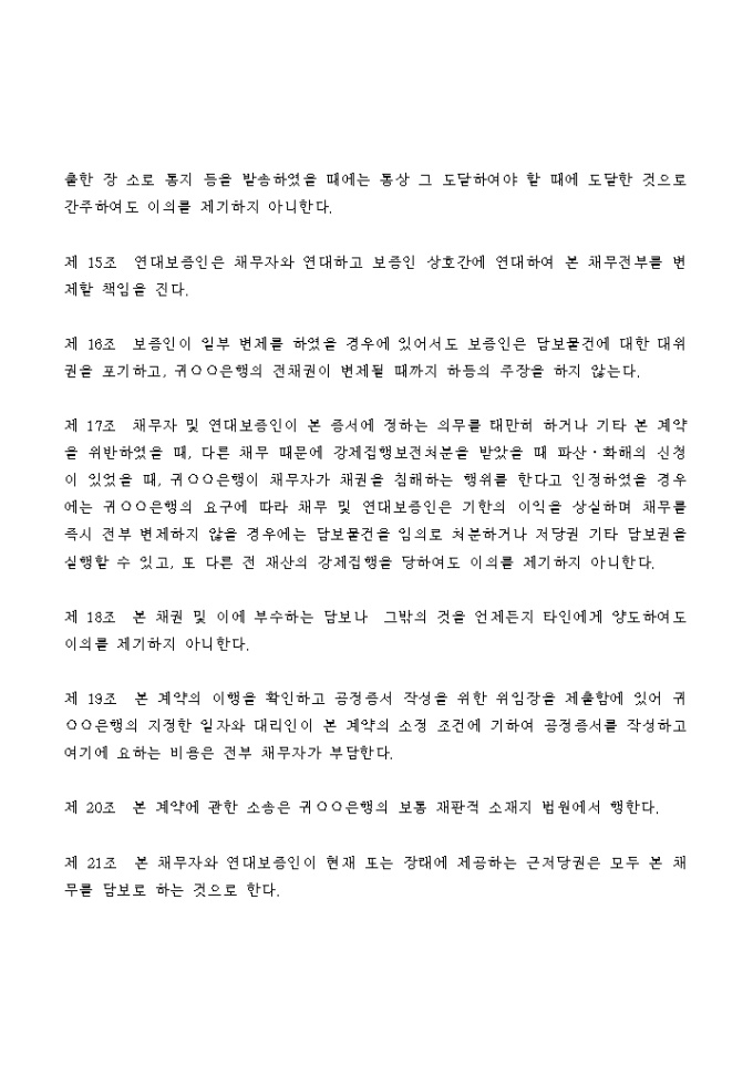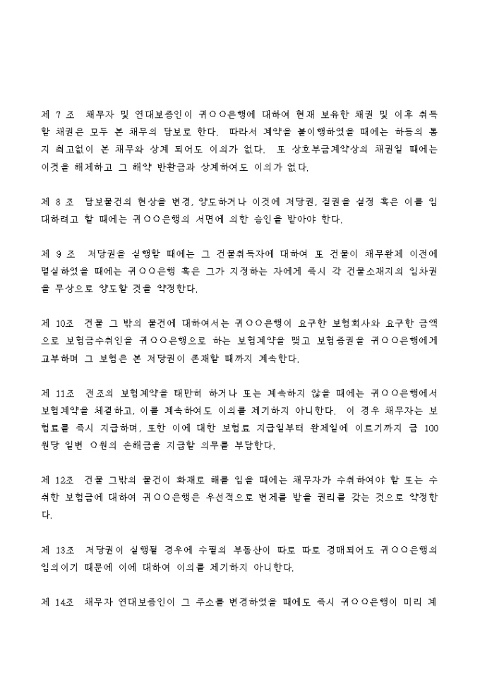 9,000원/월질권 및 저당권설정 금전차용증서 예제 입니다. 제 1 조 원금은 년 월 일까지 변제한다. 제 2 조 이자는 원금 100원에 대하여 일변 금 원으로 하며 매월 25일까지 지참하여 지급한다. 또한 연체손해금은 일변 원으로 약정한다. 제 3 조 본 채무의 담보로서 아래의 질권을 설정한다. 이것은 금후의 상호부금을 같이 담보한다. ...
