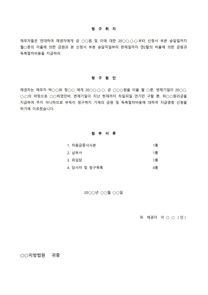 9,000원/월채무자등은 연대하여 채권자에게 금...원 및 이에 대한 소장송달익일부터 다 갚을 때까지 연2할 5푼의 비율에 의한 금원과 독촉절차비용을 지급하라는 판결을 구하는 내용입니다.