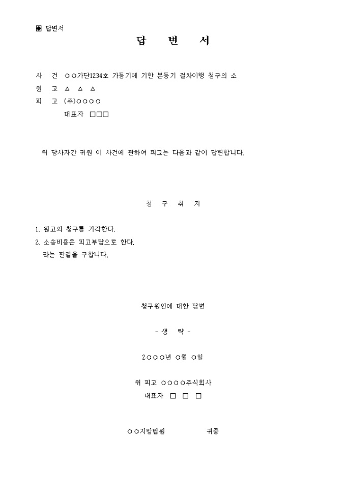 9,000원/월답변서 입니다. 1. 원고의 청구를 기각한다. 2. 소송비용은 피고부담으로 한다. 라는 판결을 구합니다. ...