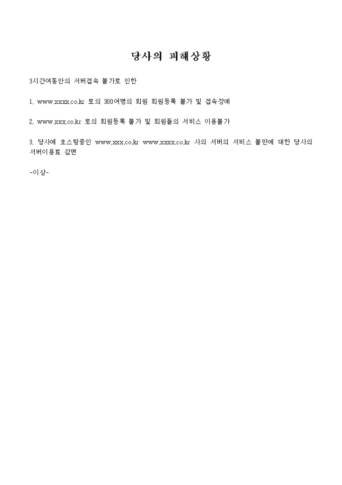 9,000원/월데이타센타 통신두절로 인한 손해배상에 대한 내용의 공문입니다.
