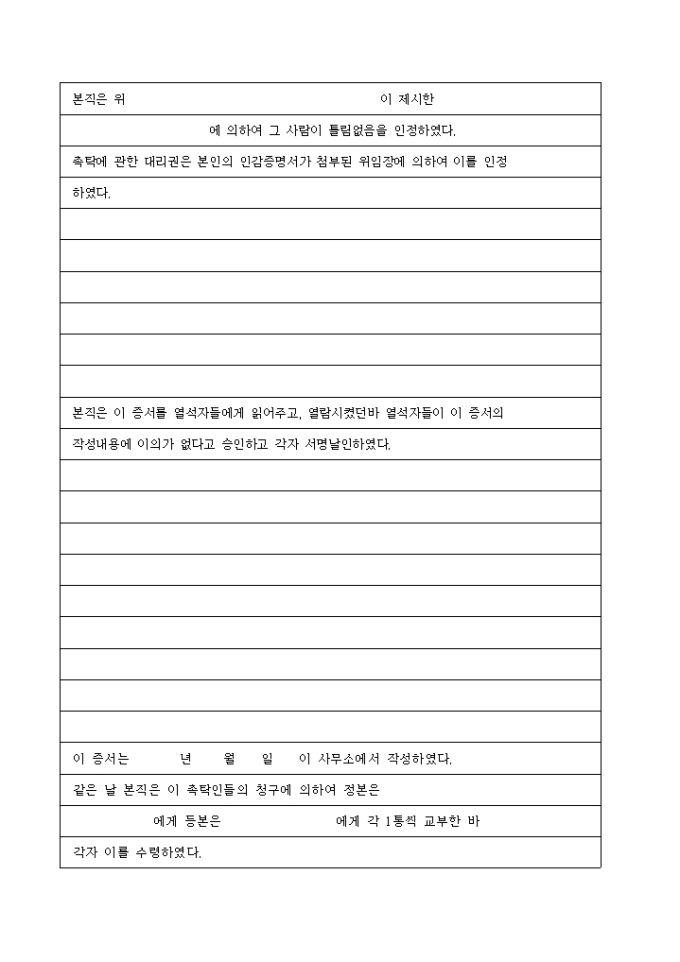 9,000원/월금전소비대차계약공정증서 예제 입니다. 제1조(목적) 채권자는 년 월 일 금 원정을 채무자에게 대여하고 채무자는 이를 차용하였다. 제2조(변제기한과 방법) 제3조(이자) 이자는 제4조(변제의 장소) 채무의 변제장소는 제5조(지연손해금) 채무자가 원금 또는 이자의 변제를 지체한 때에는 지체된 원금 또는 이자에 대하여 연 의 비율에 의한 지연손해금을 채권자에게 지급한