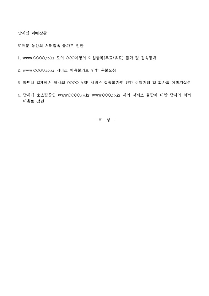 9,000원/월공문예제(손해배상관련) 양식입니다. 1. 국가 IT 산업경쟁력 강화를 위해 항상 노고가 많으심에 감사를 드립니다. 2. 당사는 귀사의 서버호스팅 서비스를 이용하던 중 지난 2002년 07월03일 오전 09시 25분 경부터 오전 10시 05분까지 당사 서버로의 접속이 불가능하였습니다. ...