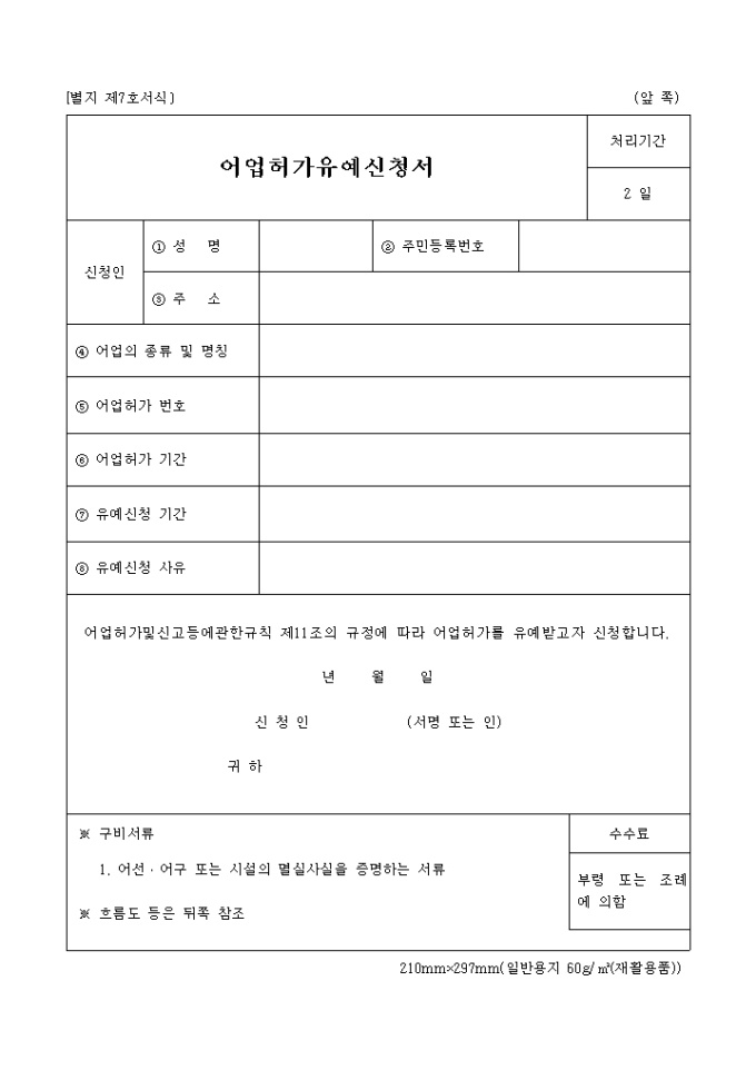 9,000원/월어업허가및신고등에관한규칙 제11조의 규정에 따라 어업허가를 유예받고자 신청할 때 사용하는 '별지제7호 어업허가 유예신청서' 양식입니다.