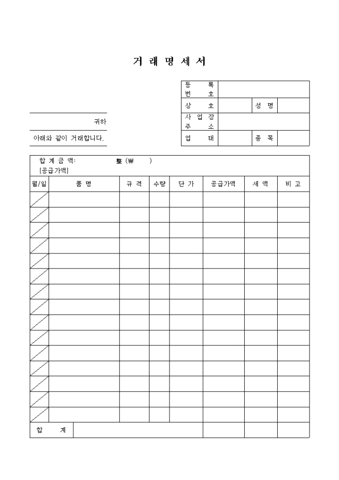 품명, 규격, 수량, 단가, 공급가액, 세액을 기록하는 한페이지가 가득 찬 거래명세서입니다.