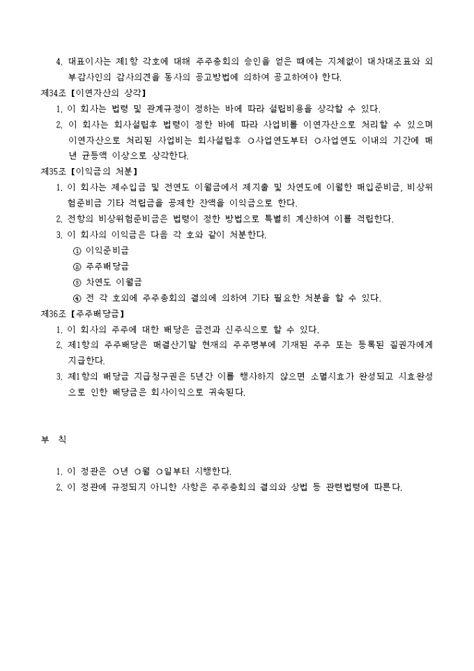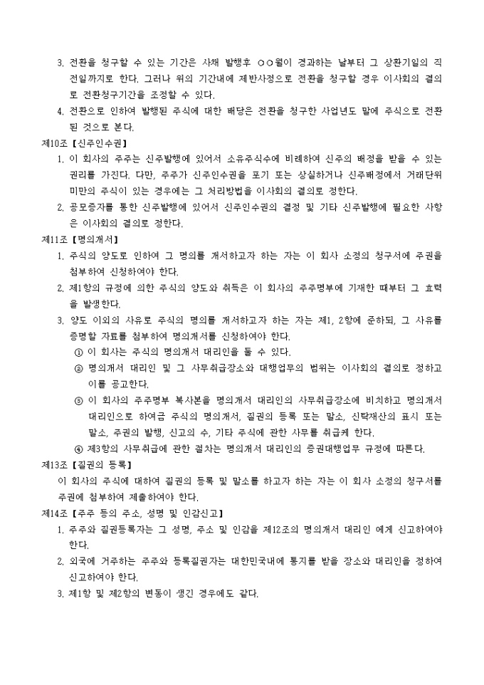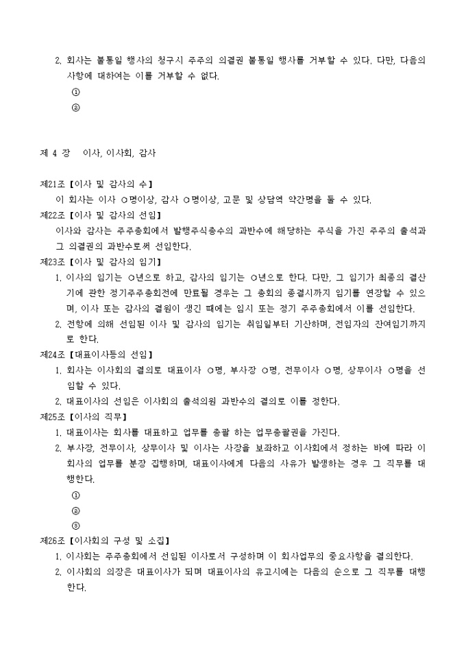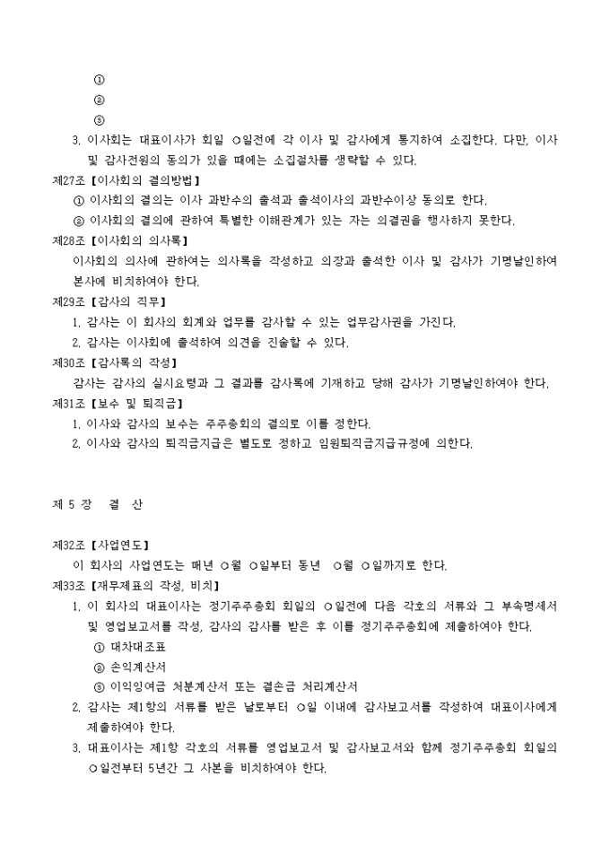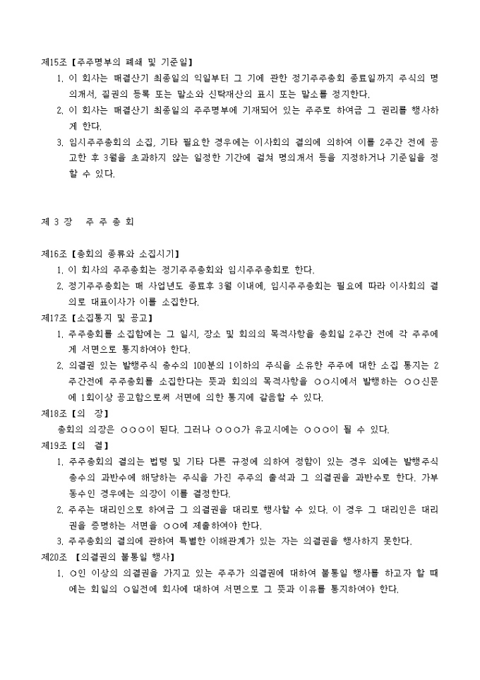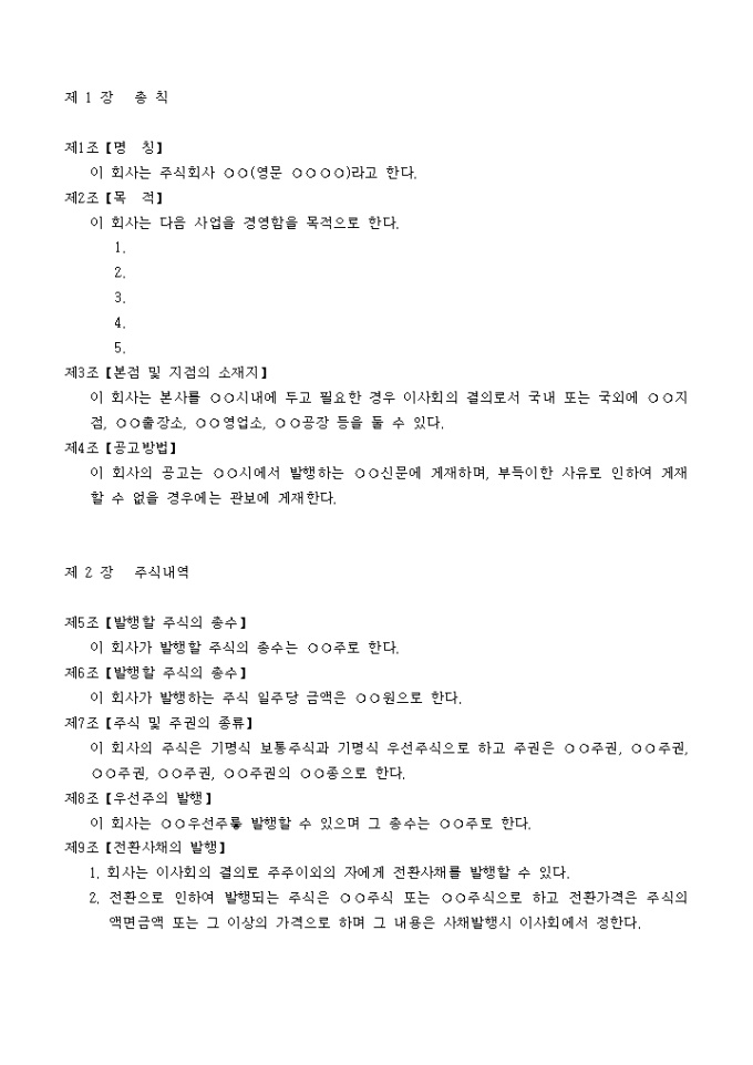 9,000원/월정관 예제 양식입니다. 제 1 장 총 칙 제1조[명 칭] 이 회사는 주식회사 ○○(영문 ○○○○)라고 한다. 제2조[목 적] 이 회사는 다음 사업을 경영함을 목적으로 한다. 1. 2. 3. 4. 5. 제3조[본점 및 지점의 소재지] 이 회사는 본사를 ○○시내에 두고 필요한 경우 이사회의 결의로서 국내 또는 국외에 ○○지점, ○○출장소, ○○영업소, ○○공장 등을 둘 수 있다. ...